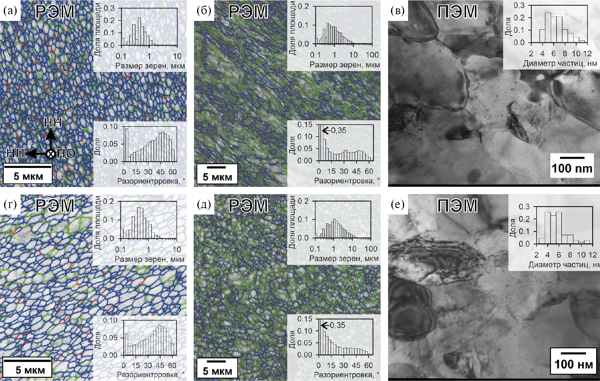 Рис. 3. Микроструктура Cu–Cr–Zr-сплава после ОТП (а–в) и старения (г–е): распределения границ кристаллитов в зоне перемешивания (а, г) и зоне термомеханического влияния (б, д) с гистограммами распределения зерен по размерам и кристаллитов по углам разориентировки, тонкая структура в зоне перемешивания (в, е) с гистограммами распределения частиц по размерам. Малоугловые границы от 2° до 15° обозначены зелеными линиями, большеугловые границы более 15° — синими линиями, и двойниковые границы S3 — красными линиями (on line). Система координат: НО — направление обработки; ПН — поперечное направление; НН — направление нормали к плоскости обрабатываемых заготовок.