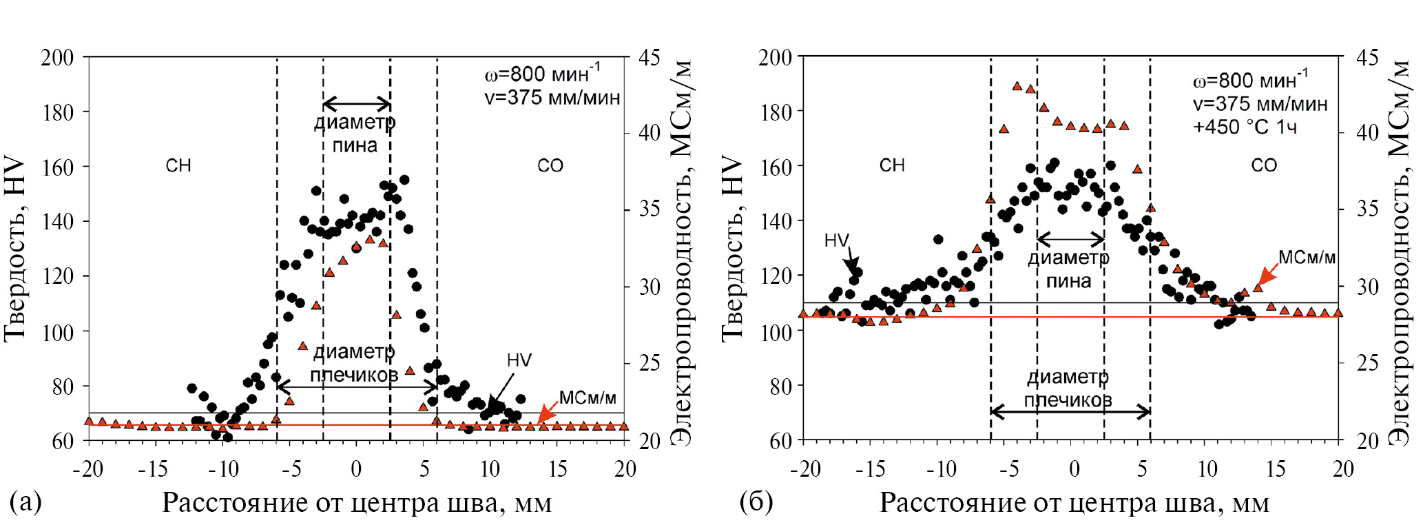 Постдеформационное старение сопровождается ростом твердости и электрической проводимости как в основном, так и в обработанном материале. Прирост твердости в основном материале составляет около 40 HV, а в зоне перемешивания около 10–15 HV. Электрическая проводимость, как в зоне перемешивания, так и в основном материале увеличивается примерно на 9 МСм/м.