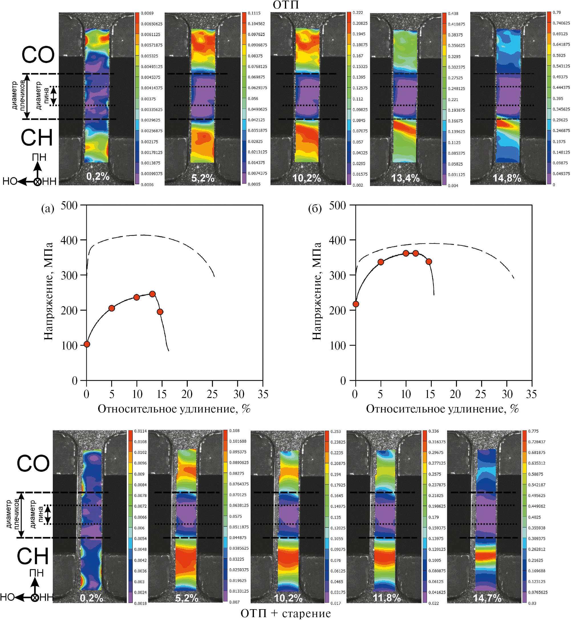 Рис. 5. Кривые “напряжение — относительное удлинение”, полученные при испытании Cu–Cr–Zr-сплава после ОТП (а) и старения (б), для образцов, содержащих основной материал (сплошные линии), и образцов, вырезанных из зоны перемешивания (пунктирные линии), с картами распределения истинной деформации в рабочей части образца. Точками на кривых отмечены участки, для которых представлены карты распределения деформации. СО — сторона отвода, СН — сторона набегания. Система координат: НО — направление обработки; ПН — поперечное направление; НН — направление нормали к плоскости обрабатываемых заготовок.