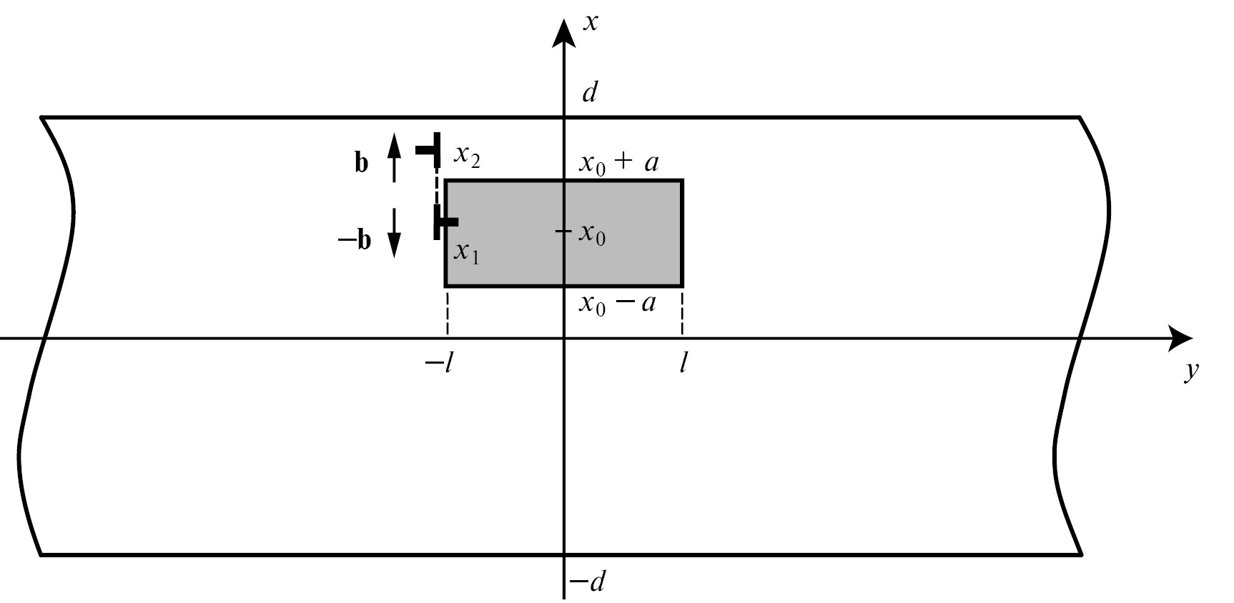 Рис. 4. Поперечное сечение включения в виде длинного параллелепипеда (нанопроволоки) с размерами 2l × 2a в нанослое толщиной 2d. Левое верхнее ребро нанопроволоки испускает диполь краевых дислокаций с векторами Бюргерса ± b, одна из которых скользит вдоль границы включения, занимает на ней равновесное положение x1 и становится дислокацией несоответствия, а вторая скользит к свободной поверхности нанослоя и либо останавливается в равновесном положении x2, либо выходит на эту поверхность. Здесь (x, y) — декартова система координат в поперечном сечении нанопроволоки.