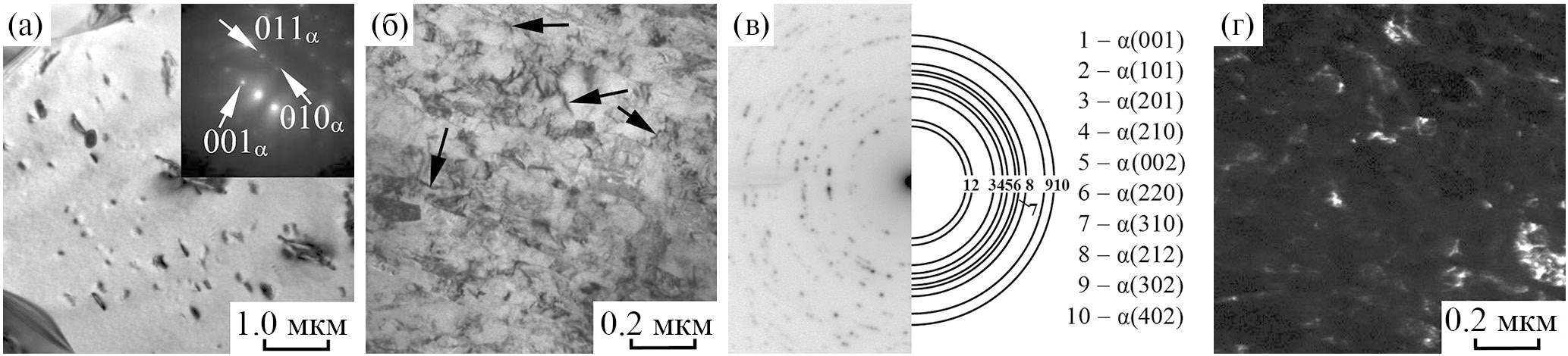ИПД приводит к измельчению зерен и формированию зеренно-субзеренной структуры в титане (рис. 1б, 1г). На светлопольном изображении в большом количестве присутствуют контура экстинкции (рис. 1б, показаны стрелками), которые локализованы, в основном, по границам субзерен и фрагментов. На микродифракционной картине наблюдается большое количество точечных рефлексов, расположенных по окружностям, с типичным азимутальным размытием, что указывает на присутствие малоугловых разориентаций на границах субзерен (рис. 1в).