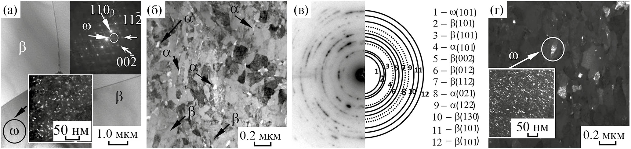 На рис. 2 приведена микроструктура сплава Ti–45Nb в КК- и УМЗ-состояниях. В КК-состоянии микроструктура представлена матричными субзернами β-фазы, дисперсно-упрочненными наноразмерной ω-фазой (рис. 2а). Идентификация микродифракционной картины показала наличие рефлексов высокой интенсивности от основной b-фазы твердого раствора титана и ниобия (ОЦК-решетка) и рефлексы низкой интенсивности от выделений w-фазы с гексагональной примитивной решеткой (ГП-решетка). На темнопольном изображении, полученном в рефлексе w-фазы, в объеме b-зерна наблюдаются наноразмерные частицы эллипсоидной формы w-фазы с размерами 10–20 нм. Средний размер зерна β-фазы составил 45 ±14 мкм.