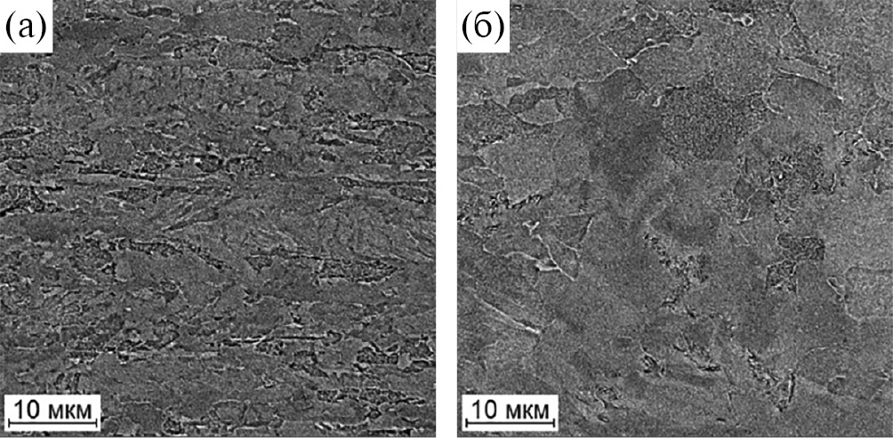 Рис. 1. Микроструктура образцов стали 05Г2МБ в обратнорассеянных электронах (сканирующая электронная микроскопия) после КТМО: а — по режиму I, б — по режиму II.