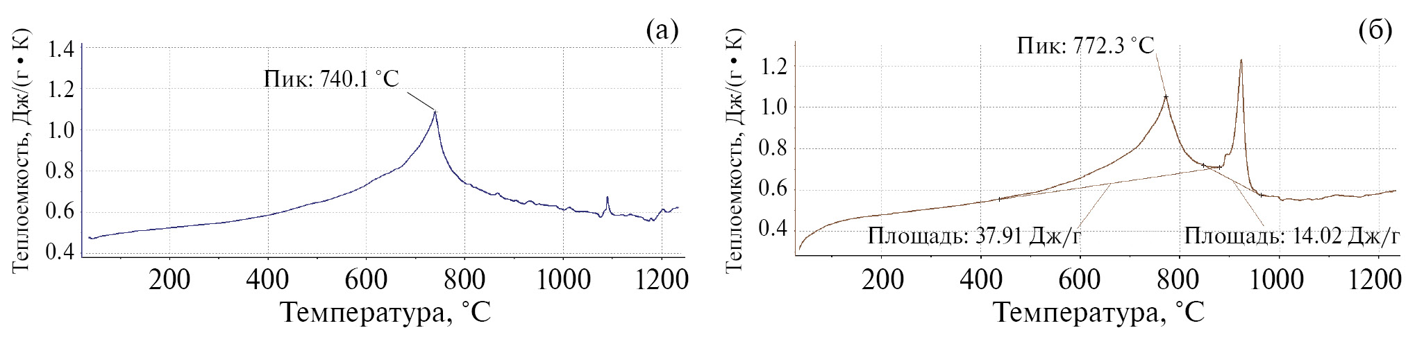 Для уточнения методики разделения пиков тепловых эффектов были получены кривые теплоемкости при нагреве эталонных материалов (рис. 2). Для сплава Fe–3%Si–0.5%Cu пик, соответствующий магнитному превращению, был зарегистрирован при температуре ~ 740 °С. Для армко-железа было зарегистрировано два пика при температурах ~ 772 °С (магнитное превращение) и ~ 917 °С (β→γ-превращение). Полученные значения находятся в хорошем согласии с литературными данными [18–20].