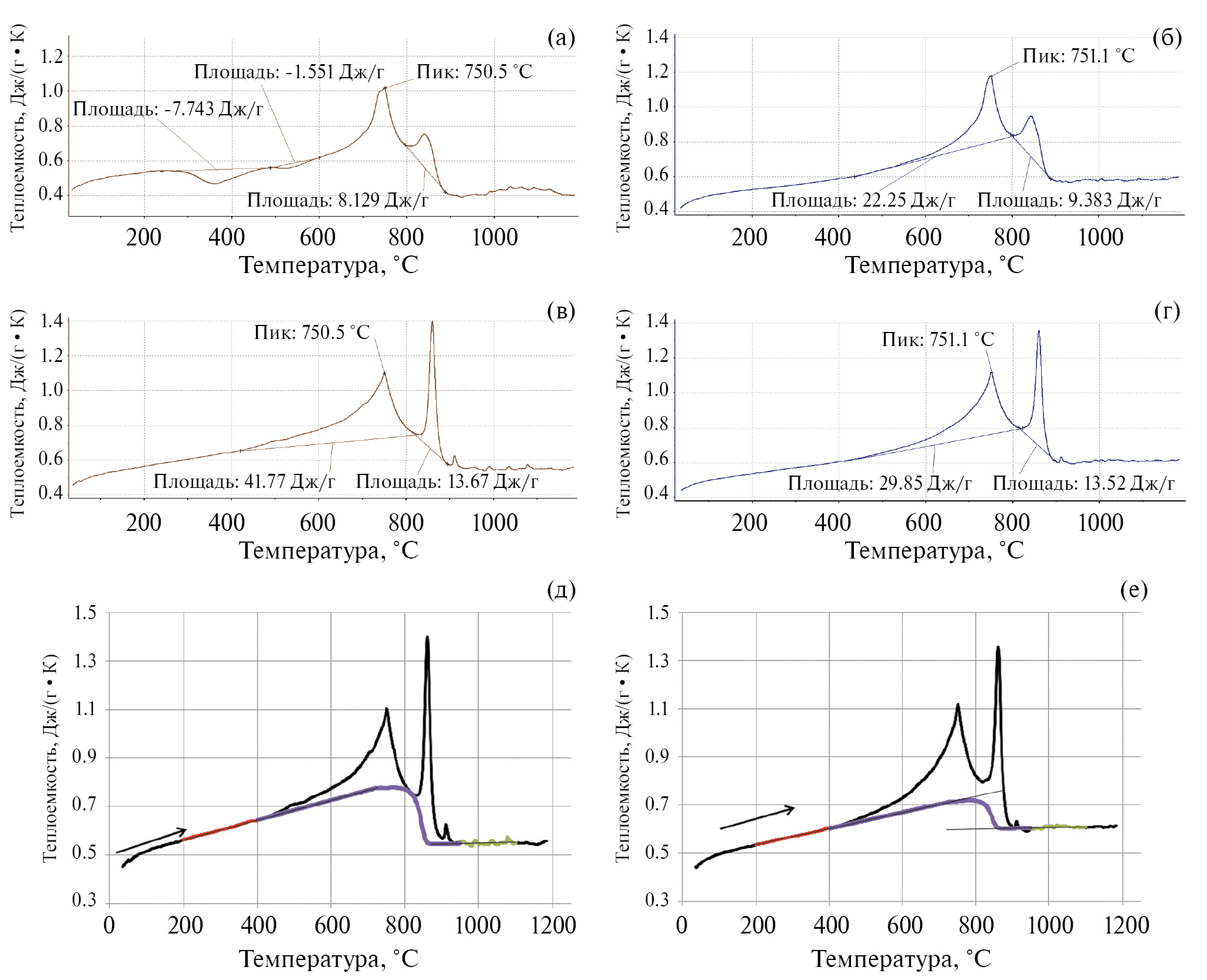 При повторном нагреве экзотермические пики на кривых теплоемкости обоих образцов становятся более обособленными (рис. 3в, г) по сравнению с первичным нагревом, эндотермические эффекты не регистрируются.