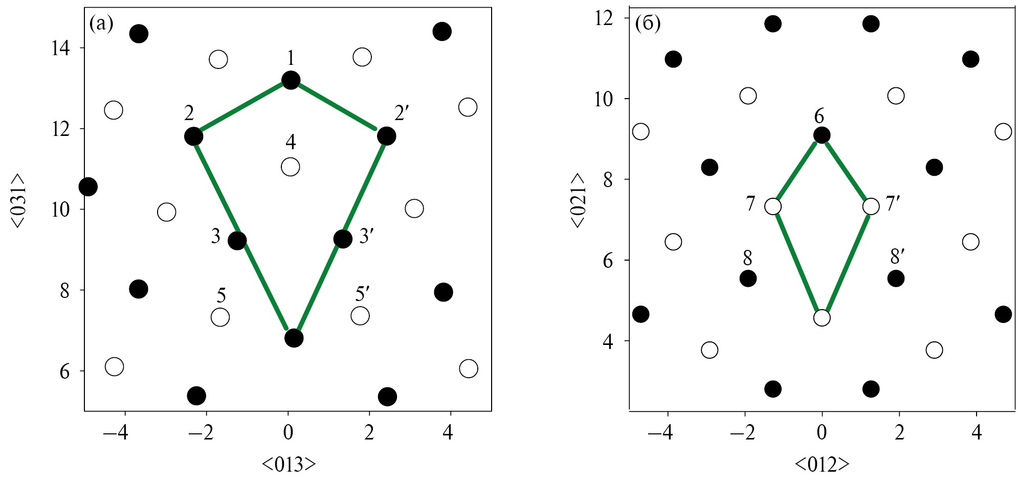 Рис. 1. Фрагменты стартовых конфигураций бикристаллов с ГЗ Σ5{013}<100> (а) и Σ5{012}<100> (б). Зеленые линии показывают структурные единицы, заштрихованные и не заштрихованные кружки – атомы в двух соседних плоскостях {100}. Расстояния по осям даны в Ả.