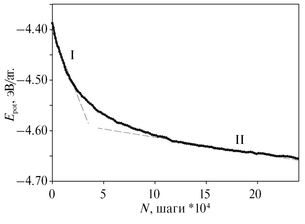 Зависимость потенциальной энергии от числа МД/МК-шагов при температуре отжига Т = 723 К для бикристалла с ГЗ Σ5{013}<100> представлена на рис. 2. С ростом числа шагов N можно условно выделить две стадии: быстрого уменьшения Epot в интервале малых времен отжига (I) и стадию II, на которой энергия Epot (N) изменяется относительно медленно. Полученная зависимость качественно совпадает с поведением Epot (N) для идеального кристаллита без ГЗ [18].