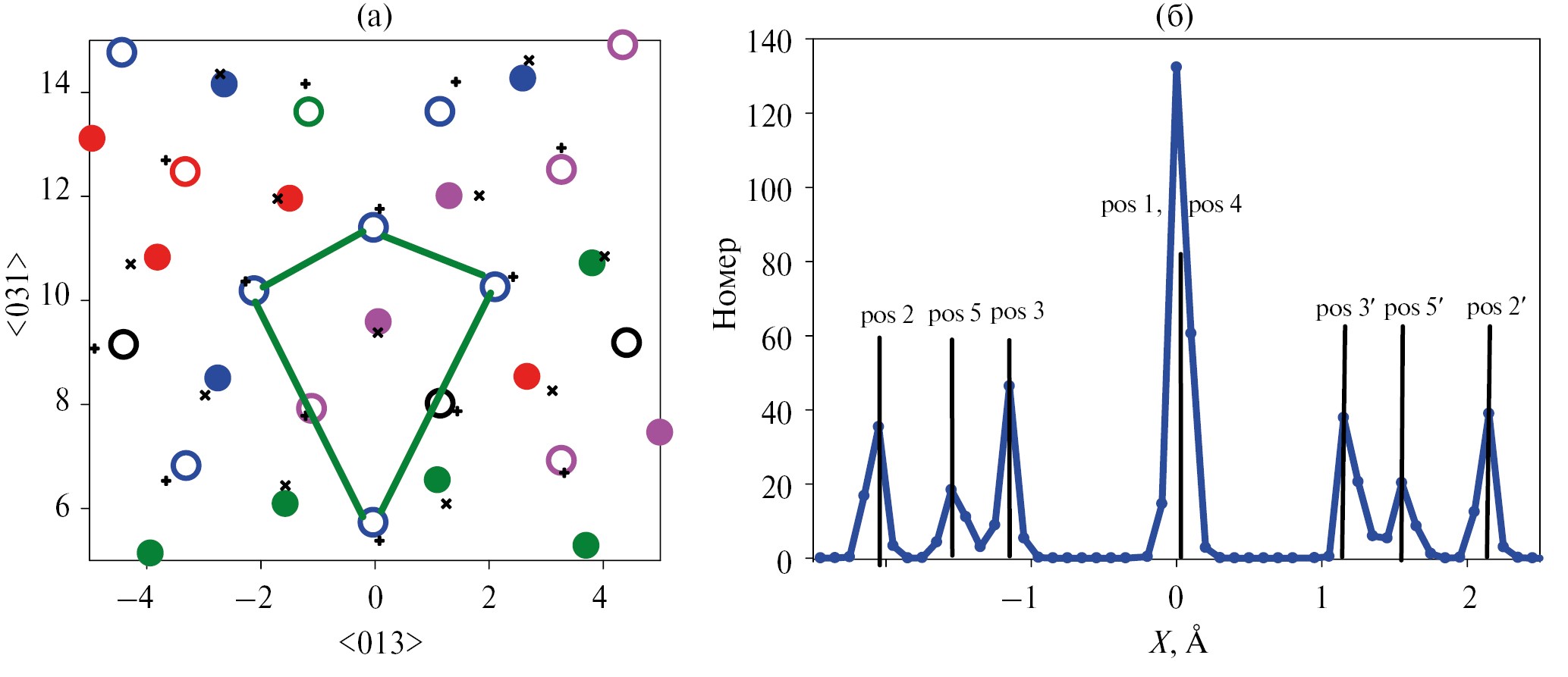 В области ГЗ происходит деформация структурного элемента и смещение атомов из своих исходных позиций (помечены крестиками на рис. 3а); такие смещения приводят к своего рода “размытию” плоскости ГЗ. На рис. 3б дана функция распределения атомов по ширине ГЗ между узлами 2 и 2ʹ, которая демонстрирует характер смещения атомов. В стартовой конфигурации атомы расположены строго упорядоченно (вертикальные линии), занимая одну позицию над другой в слоях, параллельных плоскости ГЗ. Сплошные кривые показывают разброс положений атомов в каждой из позиций после МД/МК-моделирования. Ширина разброса вдоль оси ОХ, перпендикулярной плоскости ГЗ, довольно велика и составляет ~0.5–1 Å. В результате плоскости, содержащие атомы в позициях 2, 3, 5 и 2ʹ, 3ʹ, 5ʹ, перестают быть хорошо определенным элементом структуры ГЗ.