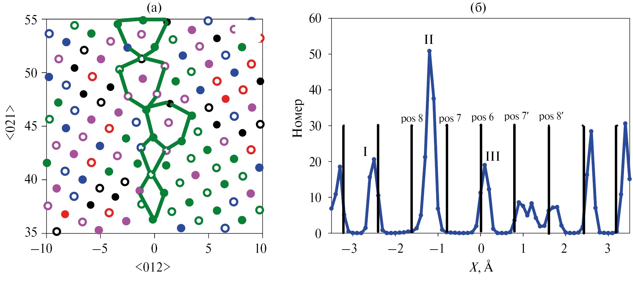 На рис. 4а показана область бикристалла вблизи ГЗ Σ5{012}<100>, которая испытала структурную реконструкцию в результате перераспределения атомов вблизи ГЗ при МД/МК-моделировании. Видно, что ГЗ Σ5{012}<100> обогащена в основном атомами Cr. Анализ структурных единиц (выделены зеленым на рис. 4а) показывает, что частично сохраняются фрагменты ГЗ, относящиеся к исходной границе (см. рис. 1б). Кроме того, появляются структурные элементы измененной формы, а положение ГЗ смещается влево или вправо от стартового положения ГЗ X = 0.