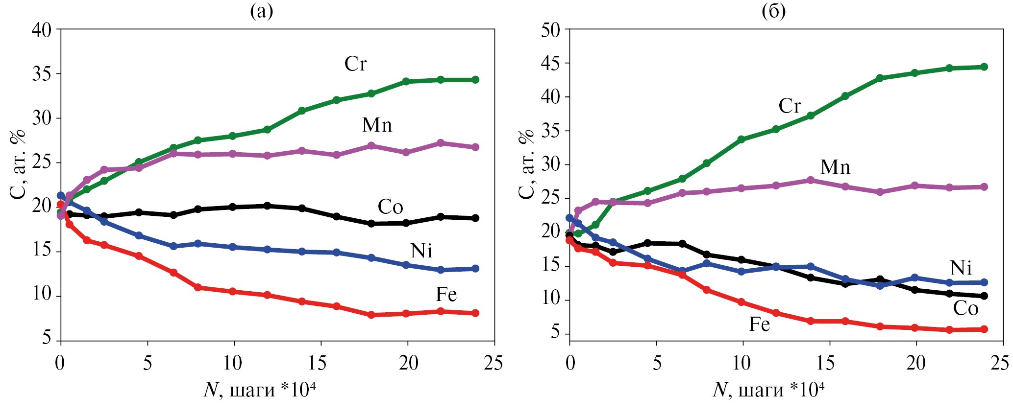 Значительный рост концентрации вблизи ГЗ Σ5{013}<100> (рис. 5а) получен для атомов Cr. К концу процедуры МД/МК-релаксации концентрация атомов Cr достигает ~35 aт. %. При этом практически постоянной остается концентрация Co и существенно уменьшается концентрация атомов Fe (примерно до 8 aт. %). Концентрация Ni также понижается до ~13 aт. %, а концентрация Mn увеличивается до ~24 aт. %. Еще более значительный рост концентрации Cr получен вблизи ГЗ Σ5{012}<100> (рис. 5б); к концу процедуры МД/МК-релаксации концентрация атомов Cr достигает 45%, а концентрация Mn увеличивается до ~25 aт. %. При этом концентрация атомов Ni и Co понижается до ~12 aт. %, атомов Fe – до ~6 aт. %.