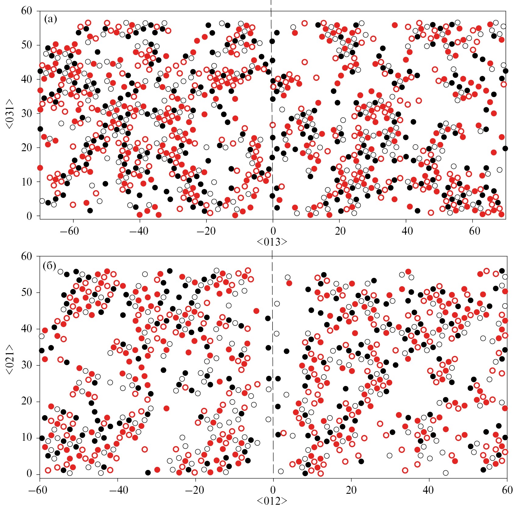 Рис. 7. Распределение атомов в двух слоях кристаллита эквиатомного сплава CoNiCrFeMn после 25 × 104 МД/МК-шагов. Красные атомы – Fe, черные – Co. (а) ГЗ Σ5{013}<100>; (б) ГЗ Σ5{012}<100>. Пунктирная линия – стартовое положение центра ГЗ.