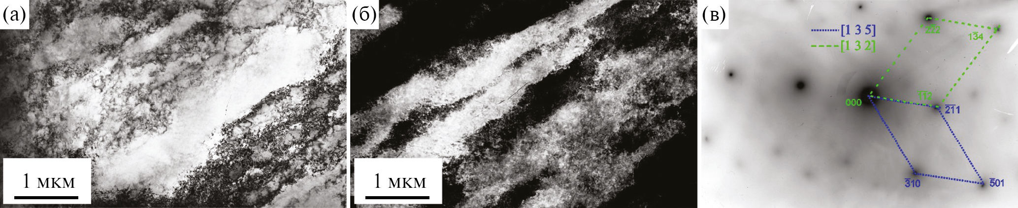 Рис. 2. ПЭМ-изображение микроструктуры ванадия, деформированного осадкой (е = 0.4): а – светлопольное; б – темнопольное в рефлексе (21); в – микродифракция и схема расшифровки, оси зон [135] и [132].