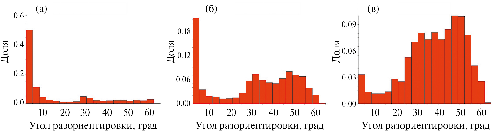 Рис. 4. Гистограммы распределения элементов структуры по углам разориентировки: а – е = 0.4 (осадка); б - е = 0.7 (φ = 5°); в – е = 1.4 (φ = 15°). По данным EBSD-анализа.