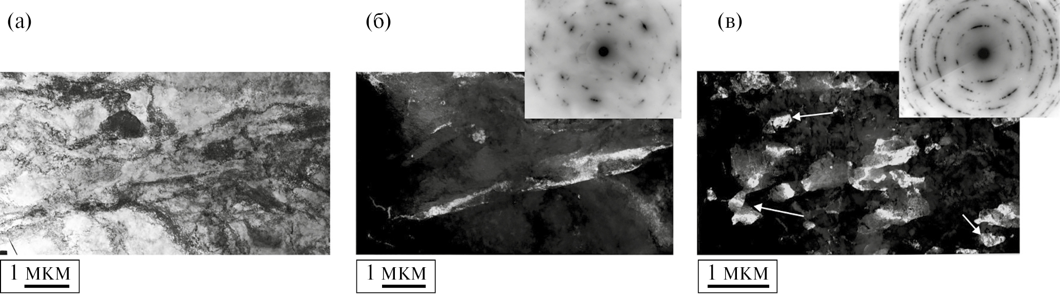 Рис. 5. Микроструктура ванадия, деформированного с е = 1.4 (φ = 15°, а, б) и е = 2.5 (φ = 45°, в); а – ПЭМ-светлопольное изображение; б, в – темнопольные изображения в рефлексах типа (110) ОЦК и микродифракции на вставках, на рис. 5в стрелками указаны микрокристаллиты.