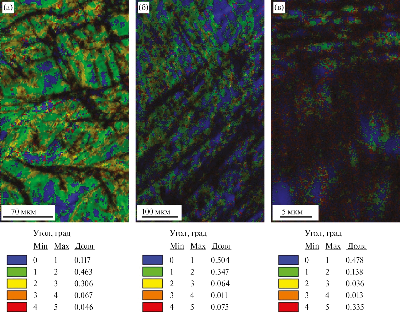 Рис. 6. Карты распределения кернер-разориентации, полученные в результате EBSD-анализа: а – е = 0.4 (осадка); б - е = 0.7 (φ = 5°); в - е = 1.4 (φ = 15°).