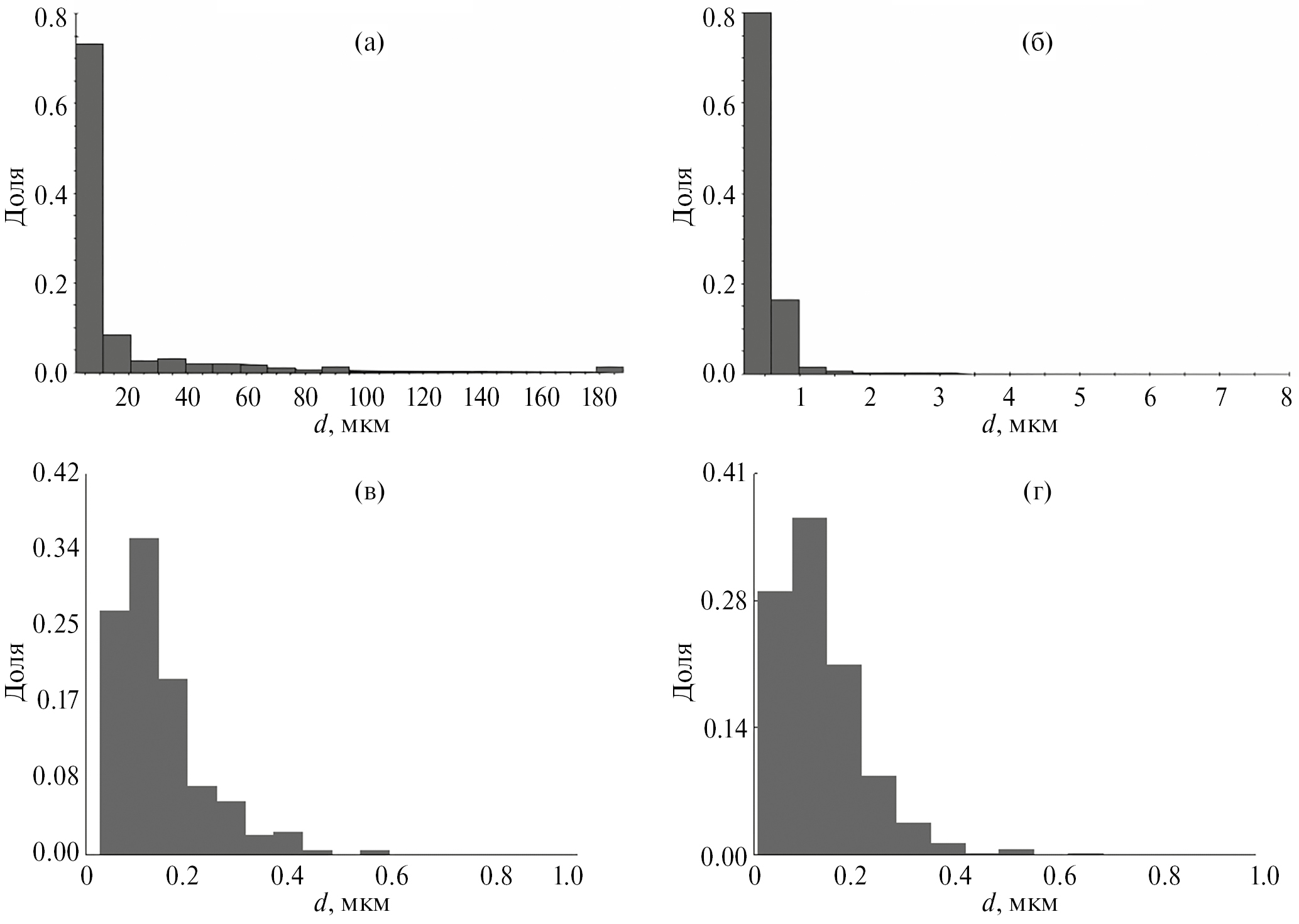Рис. 8. Гистограммы распределения элементов структуры по размерам для ванадия, деформированного СПД: а – е = 0.4; б – е = 1.4; в – е = 5.1; г – е = 8.3.