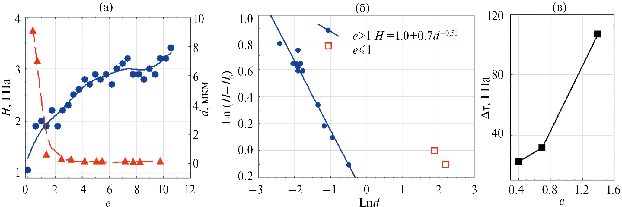 Начальный этап (е < 1) характеризуется интенсивным деформационным упрочнением. В этом случае твердость растет значительно быстрее, чем можно ожидать согласно уравнению типа Холла-Петча. При большей деформации упрочнение подчиняется уравнению Холла–Петча с показателем степени близким к –1/2, характерным для зеренной структуры. Таким образом, основной вклад в упрочнение ванадия при СПД на начальном этапе вносят дислокации, а при дальнейшей деформации – большеугловые границы.
