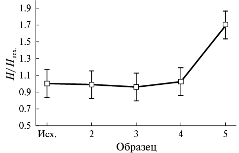 Рис. 9. Относительное изменение микротвердости образцов титанового сплава ВТ6 в результате обработки в плазме ионов N+ без нагрева (2); с нагревом образцов до температур 300°С (3), 500°С (4), 700°С (5).