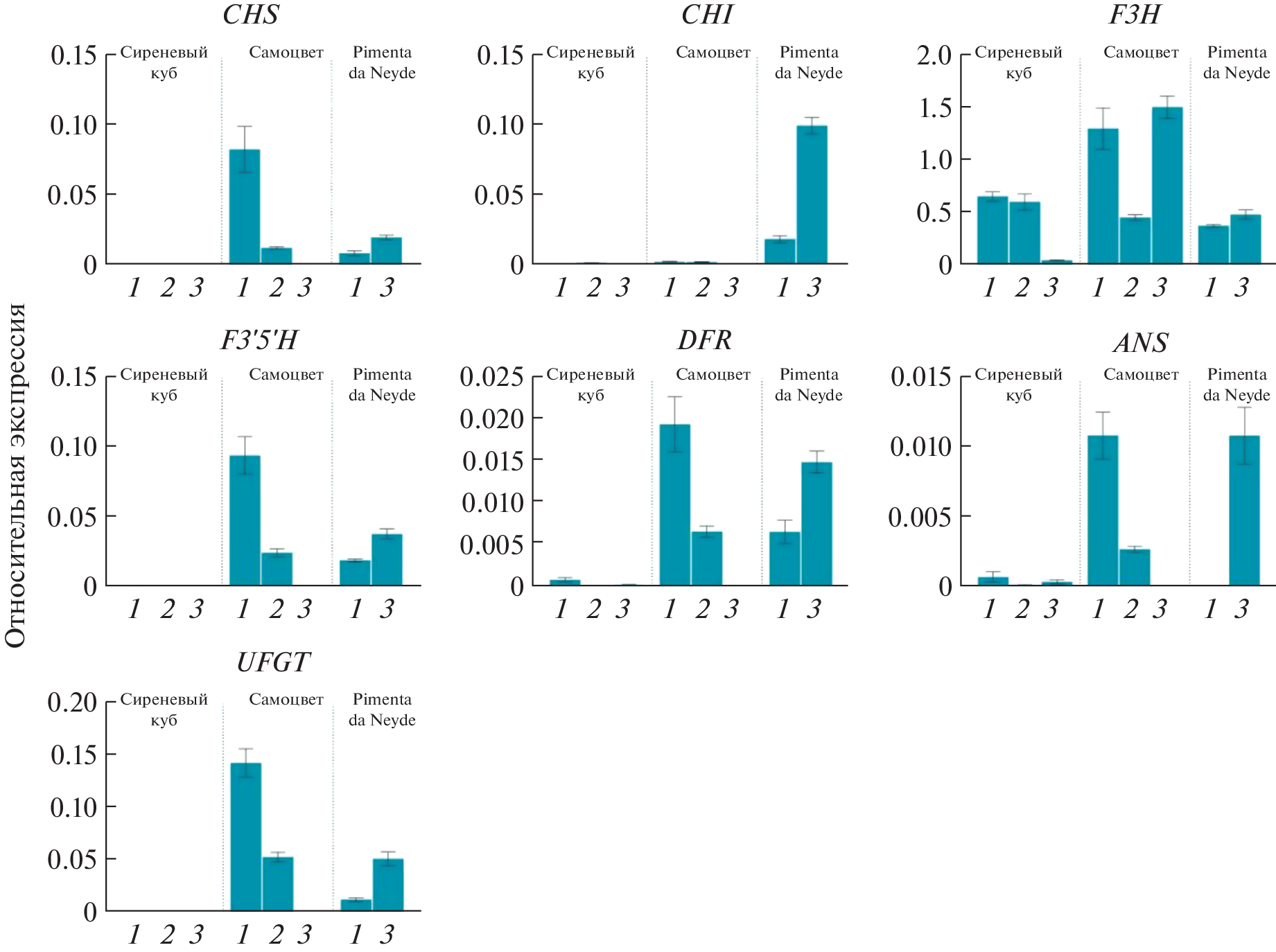 In fruits of cultivars of pepper species Capsicum annuum (Sirenevyi Cub), C. frutescens (Samotsvet) and C. chinense (Pimenta da Neyde), which differ in the pigmentation profile during maturation, the content of anthocyanins and the expression pattern of the structural and regulatory genes of anthocyanin biosynthesis were determined. Anthocyanins were found in the fruit of the Sirenevyi Cub cultivar as well as in the peel and pulp of Samotsvet and Pimenta da Neyde cultivars. In the peel of the fruits of all three analyzed cultivars, the levels of expression of structural genes for the biosynthesis of anthocyanins are two or more times higher than in the pulp. In cv. Samotsvet and Pimenta da Neyde, the expression in the pulp of CHS, F3´5´H, DFR, ANS, and UFGT are higher than that of cv. Sirenevyi Cub. The cv. Pimenta da Neyde is characterized by a high expression of structural genes in the pulp and peel of ripe fruit. Expression of transcription factor genes anthocyanin2 (R2R3-MYB) and MYC (bHLH) was detected in the peel of fruits of cv. Sirenevyi Cub as well as in the peel and pulp of fruits of cv. Samotsvet and Pimenta da Neyde at all the analyzed stages of ripening. For all structural genes of the anthocyanin biosynthesis pathway, a high correlation was found (r = 0.54‒0.93) between the expression levels of all anthocyanin biosynthesis structural genes and anthocyanin content in fruits. High correlation (r = 0.88) is also shown for MYC. For the anthocyanin2, correlation (r = 0.85) is present only for cv. Sirenevyi Cub and Pimenta da Neyde but not for cv. Samotsvet.