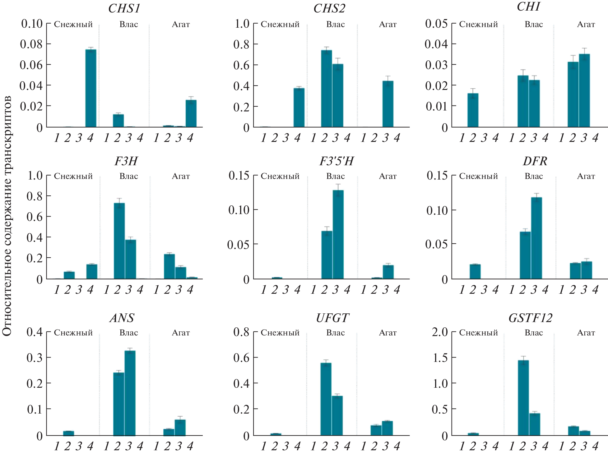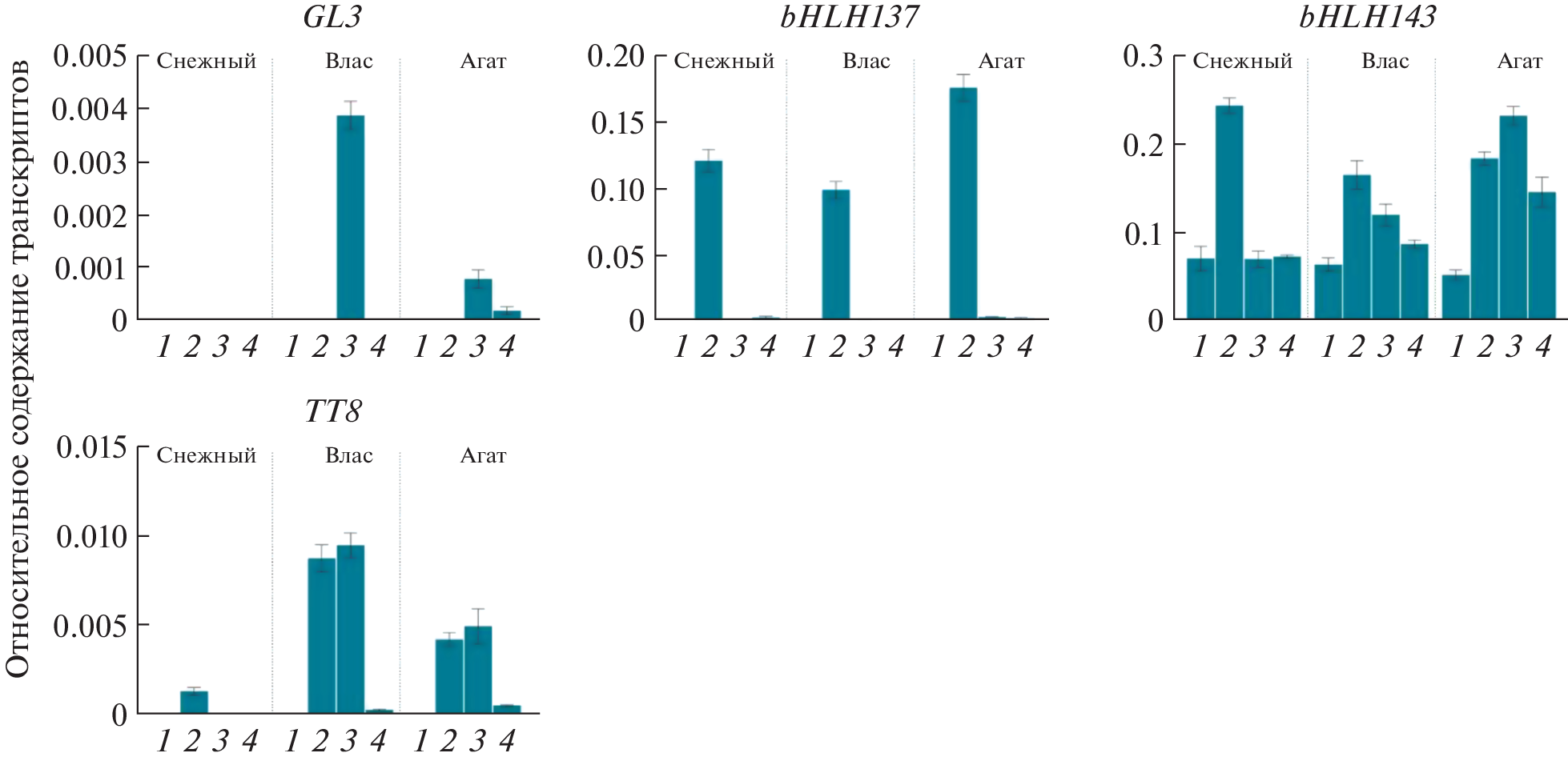 - Liu X., Han H.Q., Ge H.Y., Jiang M.M., Chen H.Y. Cloning, expression and interaction of anthocyanin-related transcription factors SmTTG1, SmGL3 and SmTT8 in eggplant // Acta Horticult. Sin. 2014. V. 41. P. 2241.