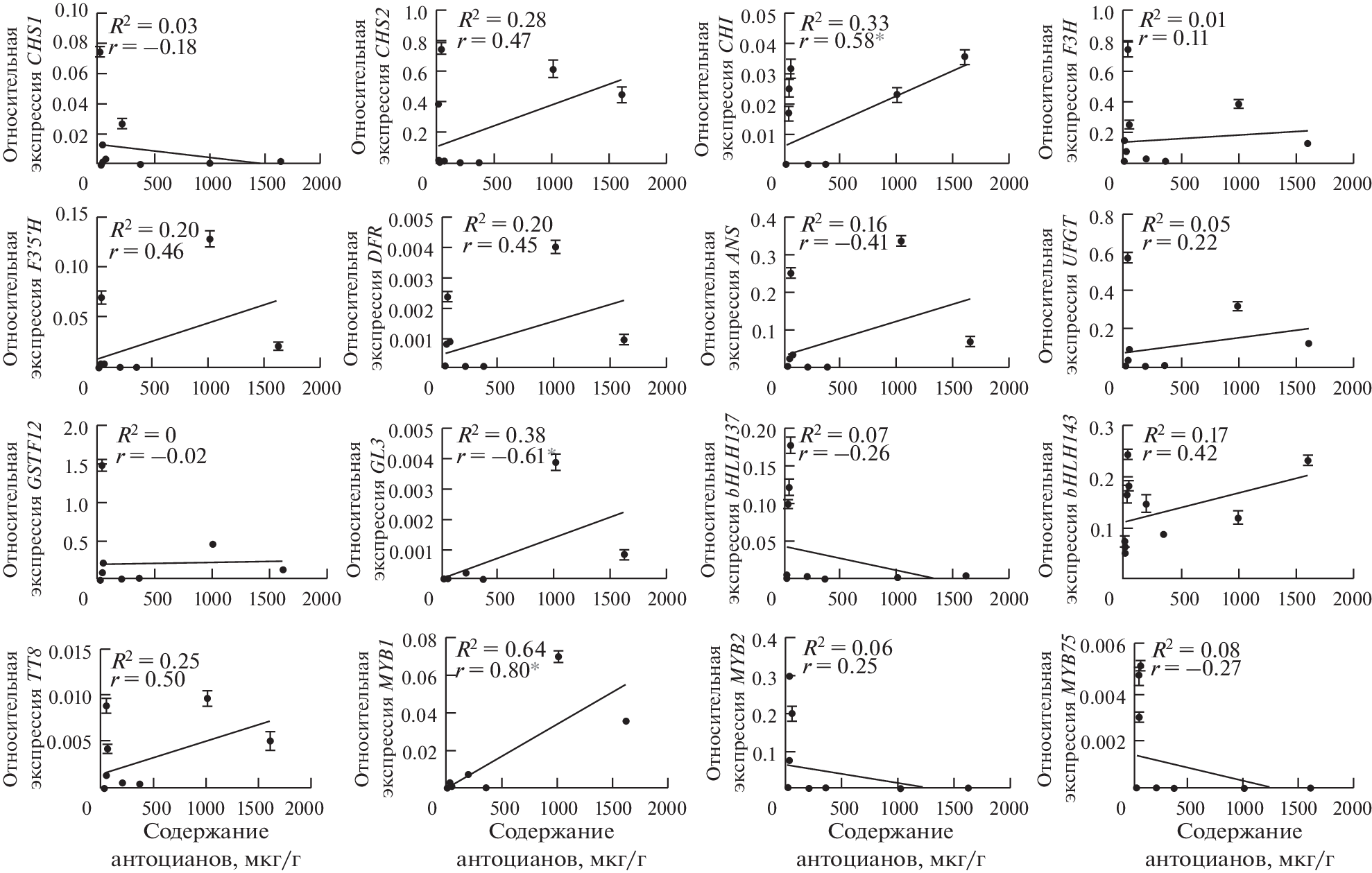 with the content of the total anthocyanins and the color of the leaf, flower petals, and fruit peel. It was shown that the gene expression pattern corresponds to the color and the presence of anthocyanins in the tissue, and also indicates the presence of organ-specific characteristics of the regulation of transcription of genes encoding transcription factors of the MBW complex. The results of correlation analysis confirm the involvement of SmbHLH137, SmTT8, SmMYB2, and SmMYB75 genes in the regulation of the expression of structural genes in flower petals and SmGL3, SmTT8, and SmMYB1 in fruit peel.