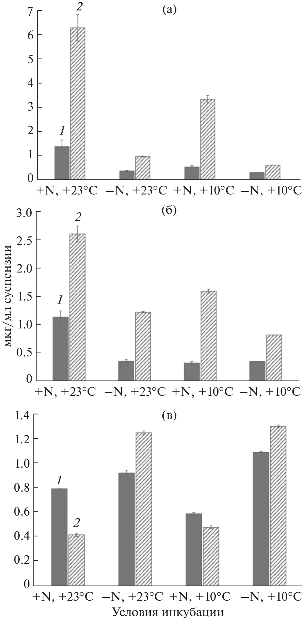 The effect of nitrogen starvation and, for the first time, low temperature, as well as their simultaneouseffect, on the physiology and ultrastructure of cells of microalgae of the genus Lobosphaera (Chlorophyta, Trebouxiophyceae) was studied. Nitrogen deficiency in both strains led to a decrease in the content ofchlorophyll by three times and an increase in the proportion of carotenoids by two times. A decrease in thecontent of both chlorophyll and carotenoids was observed at +10°C. The simultaneous effect of two factorsresulted in a threefold decrease in the chlorophyll content in NAMSU 924/2 and a sixfold decrease inNAMSU (CALU) 1497; the proportion of carotenoids in both strains decreased by 1.5–2 times. Data onultrastructural changes in cells of microalgae of the genus Lobosphaera under the influence of stress factorshave been obtained. A similar nature of the response in both strains to stress conditions was noted. Nitrogendeficiency led to the accumulation of numerous lipid droplets in the cytoplasm of cells along the cell wall. Long-term incubation on a nitrogen-free medium led to the filling of the entire volume of cells with lipiddroplets, disassembly of the membrane system of chloroplasts, that reduction in sizeand being locatedbetween densely lying lipid droplets. At low temperatures, the number of thylakoids decreased, while theinterthylakoid space and the size of chloroplasts increased. With simultaneous exposure to nitrogen starvation and low temperature, numerous lipid droplets accumulated, the number of thylakoids decreased, the interthylakoid space and the size of the chloroplast increased, which was noted under separate exposure to stress factors. The pyrenoid in both strains did not undergo significant changes in all cases.