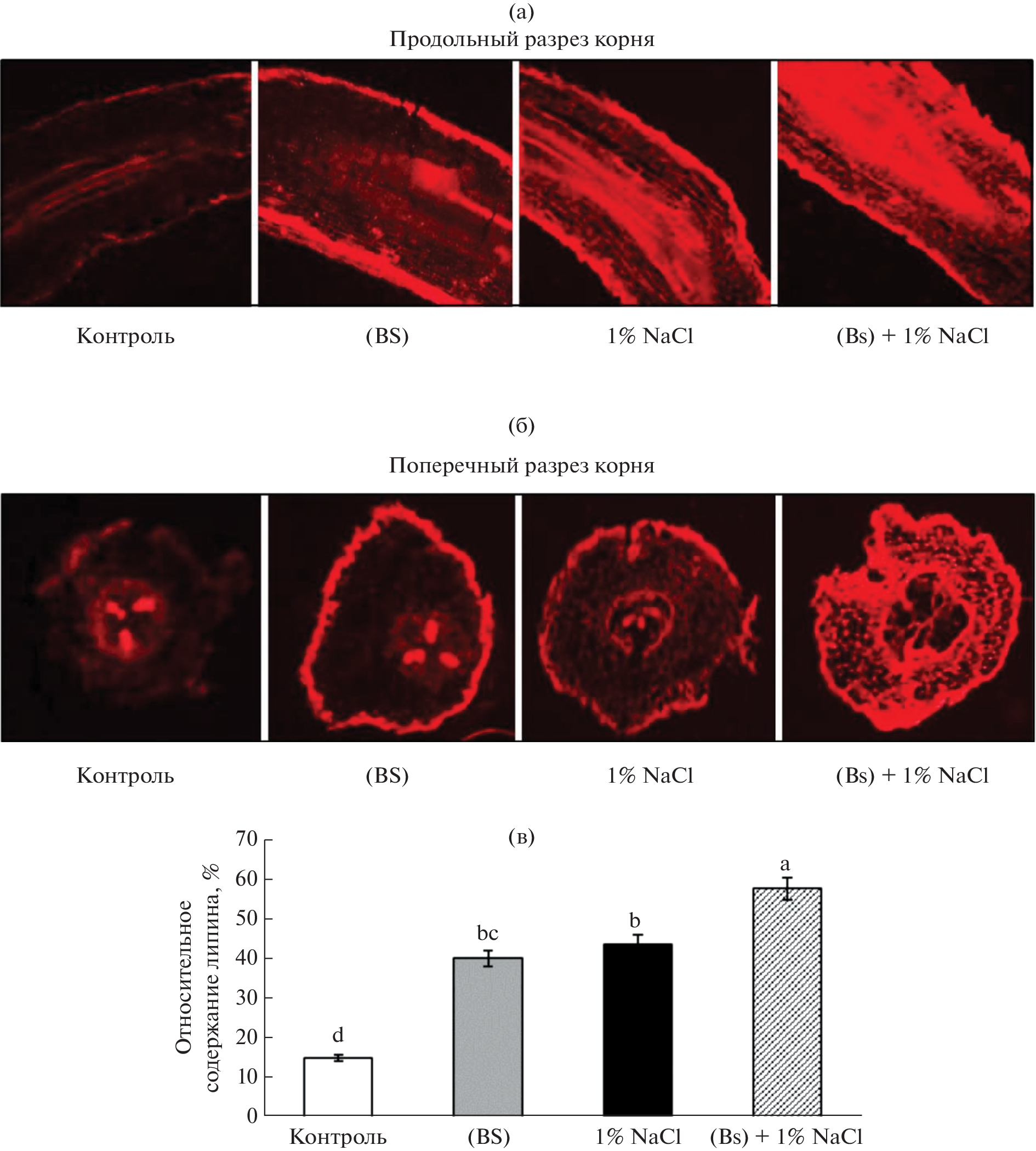 The influence of endophytic bacteria Bacillus subtilis (strain 10-4) was studied on the parameters of growth and tolerance as well as the intensity of lignin deposition in the roots of Pisum sativum L. seedlings under conditions of sodium chloride salinity (1% NaCl). It was found that the impact of salinity reduced the germination energy, viability, length of the roots and shoots of seedlings, their wet and dry weight, and also increased the content of proline and the level of lipid peroxidation (LPO). Pretreatment with strain 10-4 had a stimulating effect on seedlings in normal conditions and a protective effect on salinity, which was reflected in the improvement of germination energy and seed viability, root length, and accumulation of their dry mass under saline conditions; however, in terms of shoot growth under stress, there was no significant difference from the control (nonbacterized) variants. At the same time, strain 10-4 promoted earlier formation of lateral roots as well as a decrease in stress-induced LPO and proline content in seedlings, which indicates that cells are protected from oxidative and osmotic damage under saline conditions. Priority data were obtained on the important role of endophytic B. subtilis strain 10-4 in the process of lignification and strengthening of the barrier properties of the cell walls of the roots, which contributes to the reduction of the toxic effect of sodium chloride salinity and the implementation of the protective effect of these bacteria on pea plants.