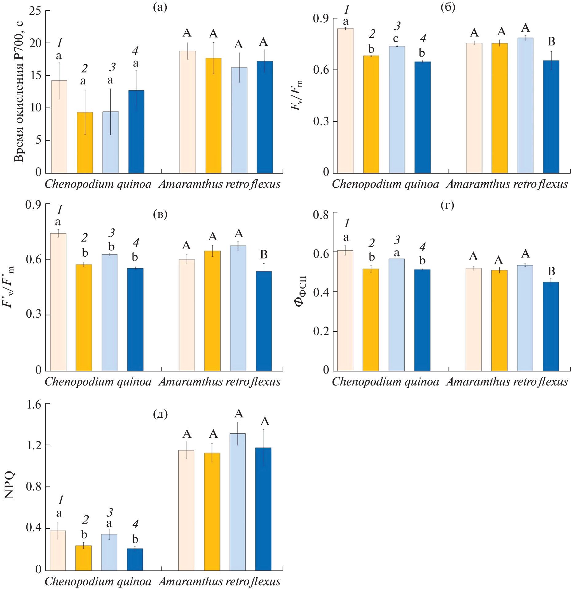The thermal stability of plants with different types of photosynthesis Chenopodium quinoa Willd. (C3) and Amaranthus retroflexus L. (C4-NAD) to short-term elevated temperature (35°С, eT) at ambient (400 ppm, aCO2) and elevated (800 ppm, eCO2) CO2 concentration was investigated. Growth parameters, water, proline, and MDA content, CO2/H2О gas exchange parameters, the functioning of PS I and PS II, and the content of key photosynthetic (Rubisco, PEPC) and photorespiratory (GDC) enzymes were analyzed. Under control conditions, C4-type plants, compared with the C3-type, show higher values of dry biomass growth, intensity of visible photosynthesis, transpiration, and PS I activity and lower proline content. The photosynthetic and stomatal apparatus of both types was sensitive to eT, which manifested itself in a decrease in the intensity of apparent photosynthesis and transpiration. In addition, suppression of light reactions (PS II) and intensity of photorespiration (according to GDC) was observed in the C3-species and an increase in the content of proline in the C4-species. Under eCO2 conditions, the C3-species showed a decrease in the intensity of photorespiration, while oxidative stress (twofold increase in the content of MDA) was accompanied by reduced intensity of apparent photosynthesis, transpiration, and increased intensity of dark mitochondrial respiration in the C4-species. A softening effect of eCO2 on thermal stability data for C3- and C4-plants was not established. With the combined action of eCO2 and eT, both types exhibited oxidative stress, reduced efficiency of PS II and apparent photosynthesis, and activation of dark respiration. However, differences were also observed: oxidative stress was accompanied by a decrease in the increase in dry biomass and water content in tissues, as well as suppression of photorespiration, in the C3-species, while there was a decrease in the intensity of transpiration and an increase in the content of PEPC in the C4-species. Reduced WUE with combined action of eCO2 and eT in plants of the C4-species was less significant than the C3-species. The different response of quinoa plants (C3) and amaranth (C4) on the combined effect of climatic factors of elevated temperature and CO2 concentration is discussed.