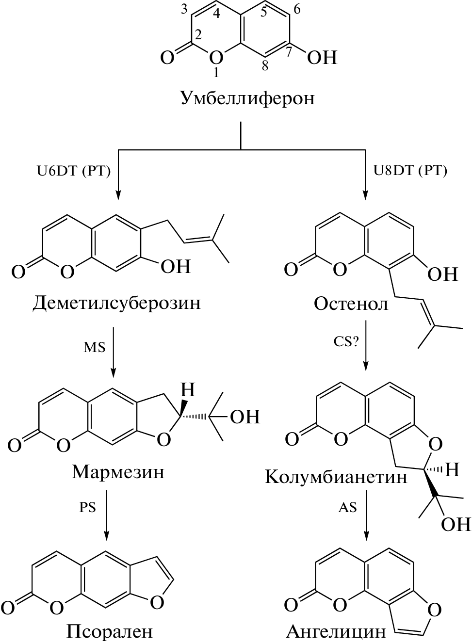 - Brown S.A., Steck W. 7-Demethylsuberosin and osthenol as intermediates in furanocoumarin biosynthesis // Phytochemistry. 1973. V. 12. P. 1315. https://doi.org/10.1016/0031-9422(73)80558-8