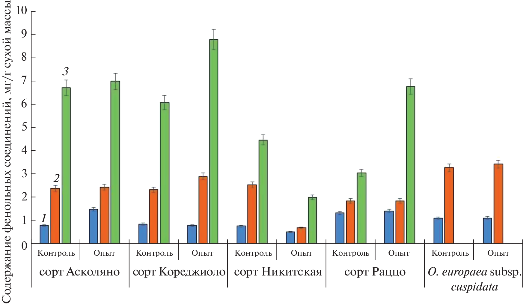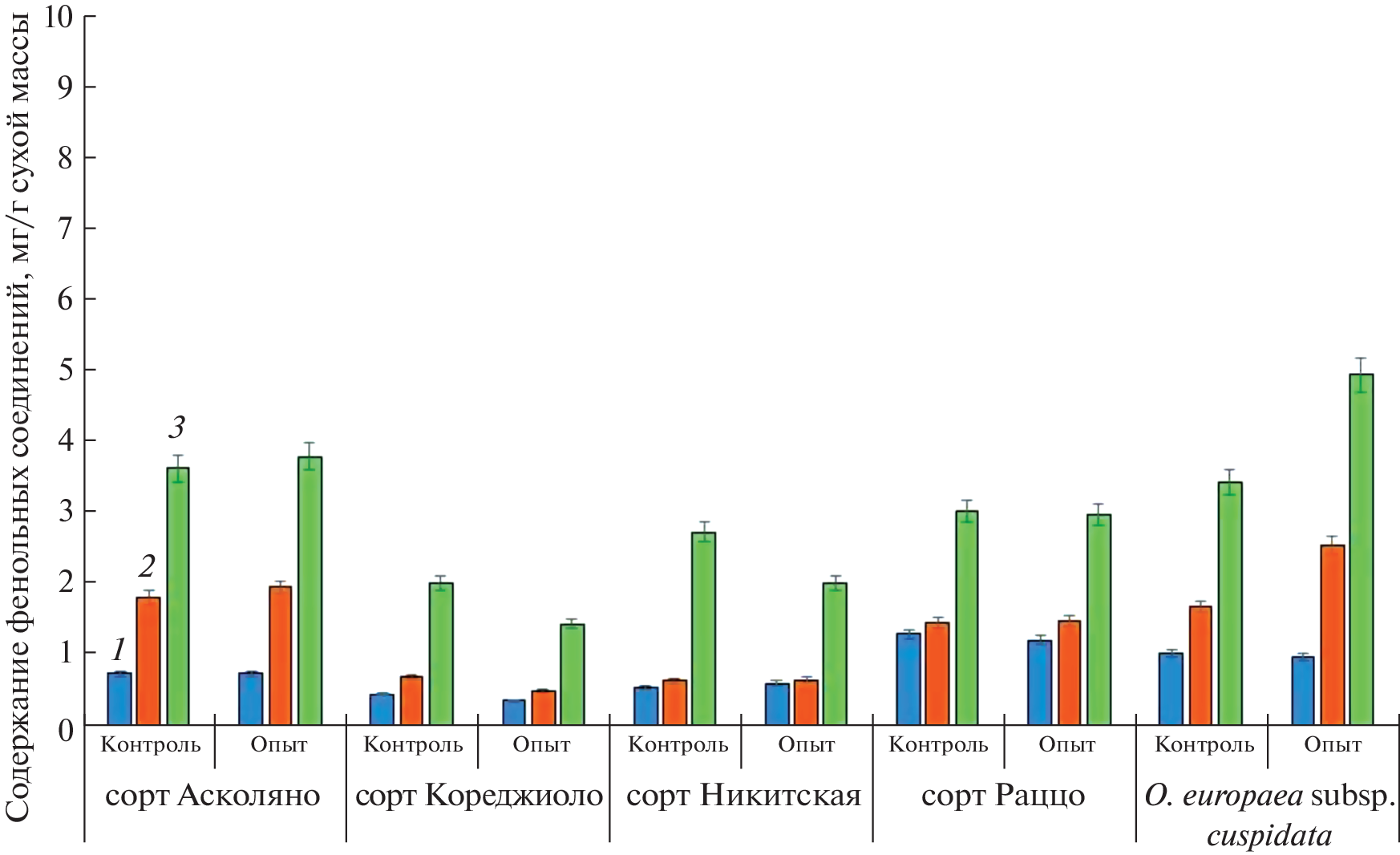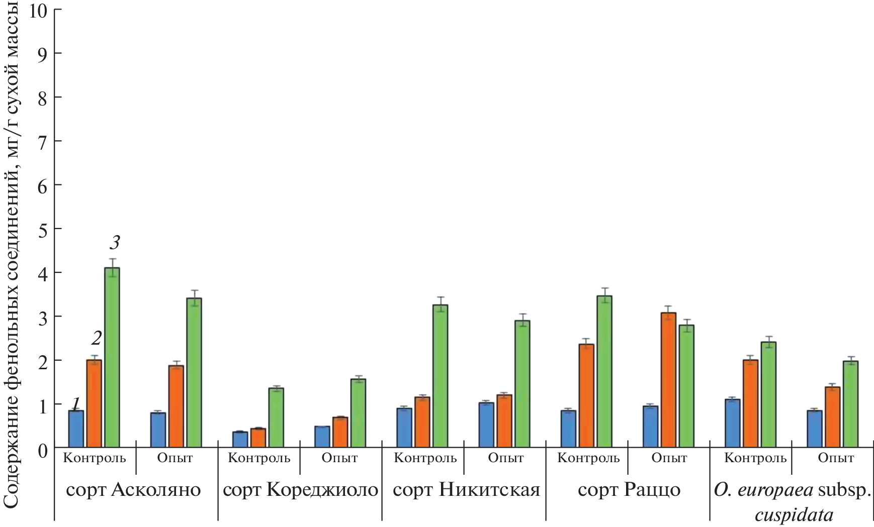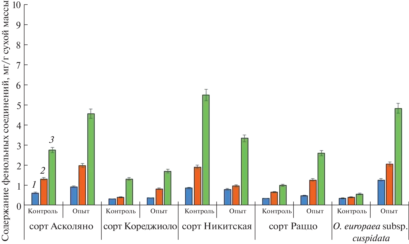 The degree of participation of oleuropein, rutin, and cinaroside in the processes of formation of winter hardiness and frost resistance in four varieties of European olives Olea europaea L. and subspecies O. europaea subsp. сuspidata (Wall. and G. Don) Cif. was determined in natural and laboratory conditions. To assess the level of stress in the leaves, the proline content was determined, the maximum of which was noted in the weakly resistant subspecies O. europaea subsp. сuspidata. To identify the peculiarities of the accumulation of phenolic substances in natural conditions, the changes in their content in leaves and the average 10-day values of equivalent effective temperatures were compared. In laboratory conditions, the content of phenolic compounds was studied under different cooling modes: 0°C, 6 h → –8°C, 8 h (option 1); 0°С, 6 h → –2°С, 6 h → –8°С, 8 h (option 2); –8°C, 8 h (option 3); –8°C, 12 h (option 4). It was found that keeping shoots at 0°C for 6 h had a positive effect on O. europaea’s winter hardiness, while 6 h of exposure at –2°C led to the development of stress. In the first variant of the experiment, the oleuropein content increased in the resistant variety Nikitskaya. In varieties with an average degree of resistance (Razzo and Ascolano), activation of the biosynthesis of flavonoids and oleuropein was observed. In the weakly resistant Coreggiolo variety, phenolic substances were actively consumed, and trace amounts of oleuropein and no changes in the content of rutin and cynaroside in the subspecies O. europaea subsp. cuspidata, probably, were associated with his less close family ties with O. europaea. It was revealed that, in genotypes with low frost resistance, activation of the synthesis of phenolic compounds occurred only under the influence of a stress factor (–2°C), which did not allow them to adapt in a timely manner, whereas these processes began at earlier stages of cold adaptation in relatively resistant varieties. For the varieties Coreggiolo, Razzo and Ascoliano, prolonged exposure to negative temperatures was a critical factor, while it was lethal for O. europaea subsp. cuspidata (option 4). Differences in the synthesis of phenolic compounds identified under these conditions were are associated not only with the degree of frost resistance but also with the variety specificity of O. europaea genotypes. The obtained data suggested that oleuropein, rutin, and cynaroside are elements of the mechanisms of protection of olive plants from the negative effects of negative temperatures. Apparently, the studied compounds play the role of cryoprotectors and antioxidants and participate in the formation of winter hardiness. The conditions for activating the biosynthesis of phenolic compounds were of great importance. In the highly resistant variety Nikitskaya, their accumulation occurred under the influence of temperatures close to 0°С and directly during the initial damaging temperatures in the unstable varieties Coreggiolo and subspecies O. europaea subsp. сuspidata.