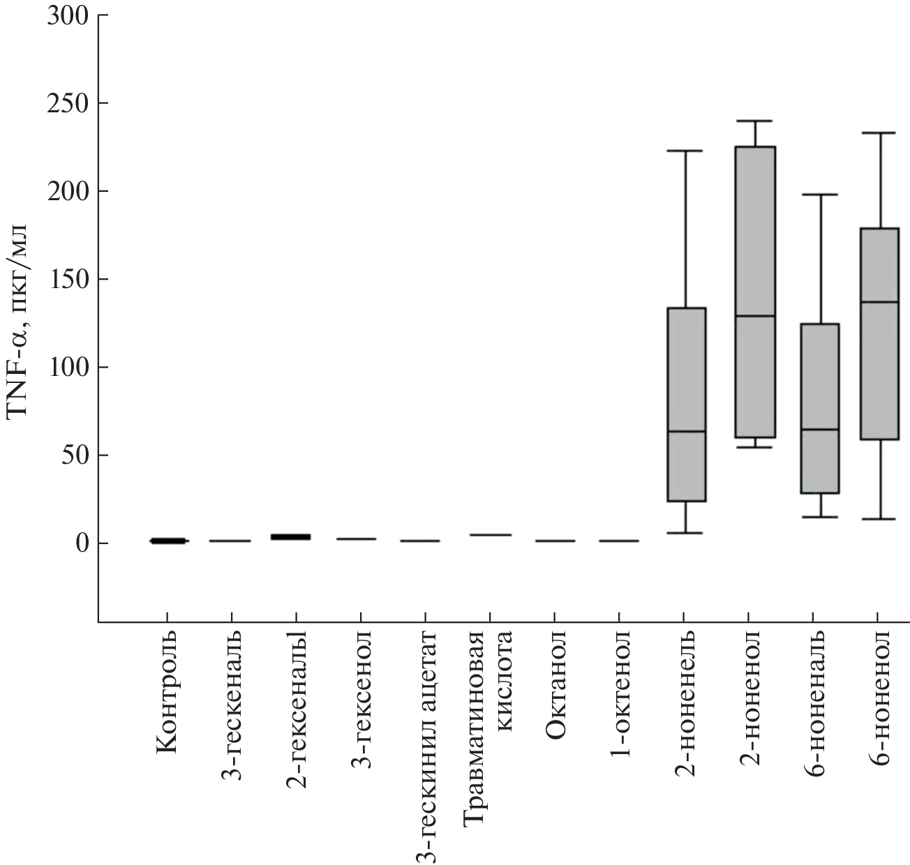 Коротко- и среднецепочечные альдегиды и их производные, образующиеся из жирных кислот в результате активности ферментов гидропероксидлиаз, присутствуют во многих продуктах растительного происхождения. Их часто используют в качестве добавок к продуктам питания для увеличения срока годности и придания аромата свежести. Учитывая, что эти соединения могут всасываться клетками кишечника и поступать в системную циркуляцию, важно оценить их влияние на здоровье человека. В данной работе мы оценили потенциальную биологическую активность альдегидов и спиртов с длиной цепи от 6 до 9 углеродов и проверили их провоспалительную активность на экспериментальной системе, основанной на использовании цельной крови доноров. Анализ показал, что девятиуглеродные оксилипины стимулируют наработку провоспалительного цитокина TNF-α (фактор некроза опухоли-альфа), при этом альдегиды активировали синтез TNF-α в меньшей степени, чем спирты. Шести- и восьмиуглеродные оксилипины не проявляли провоспалительную активность. Полученная информация может быть полезна для разработки диетологических рекомендаций для людей, страдающих воспалительными заболеваниями.
