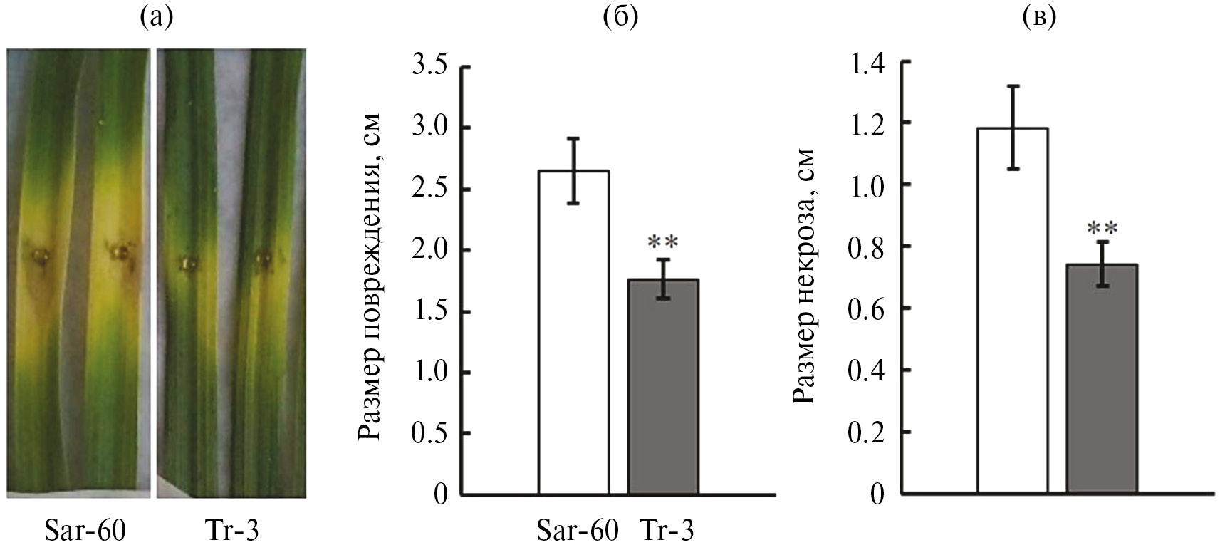 Рис. 3. Восприимчивость трансгенной линии пшеницы Tr-3 к Botrytis cinerea. (а) Репрезентативные изображения зараженных листьев на пятые сутки после инфицирования; (б) Размер суммарного повреждения листьев; (в) Размер некротических повреждений листьев. Данные представляют собой средние значения трех независимых экспериментов по 6–7 биологических повторностей со стандартной ошибкой среднего. ** – статистически значимое различие между двумя генотипами при P < 0.01, согласно оценке по t-тесту Стьюдента.