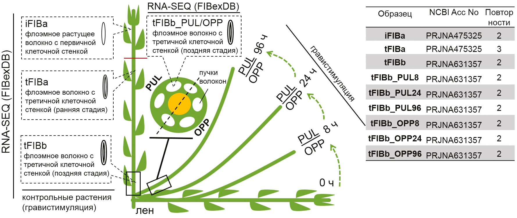 Рис. 1. Схема отбора образцов (изолированных волокон льна) для оценки экспрессии генов. Данные экспрессии загружены в FIBexDB [18]; iFIBa – интрузивно растущие волокна, tFIBa – ранняя стадия формирования ТКС (третичной клеточной стенки), tFIBb – поздняя стадия формирования ТКС; 8, 24, 96 ч – время фиксации образцов после наклона стебля; PUL – pulling side (тянущая сторона), OPP – противоположная PUL-стороне. Справа в таблице приведены номера проектов в NCBI, в которых опубликованы сырые данные транскриптомных анализов. Нормализованные данные для всех транскриптомных экспериментов можно найти в FIBexDB (https://ssl.cres-t.org/fibex/flax/).