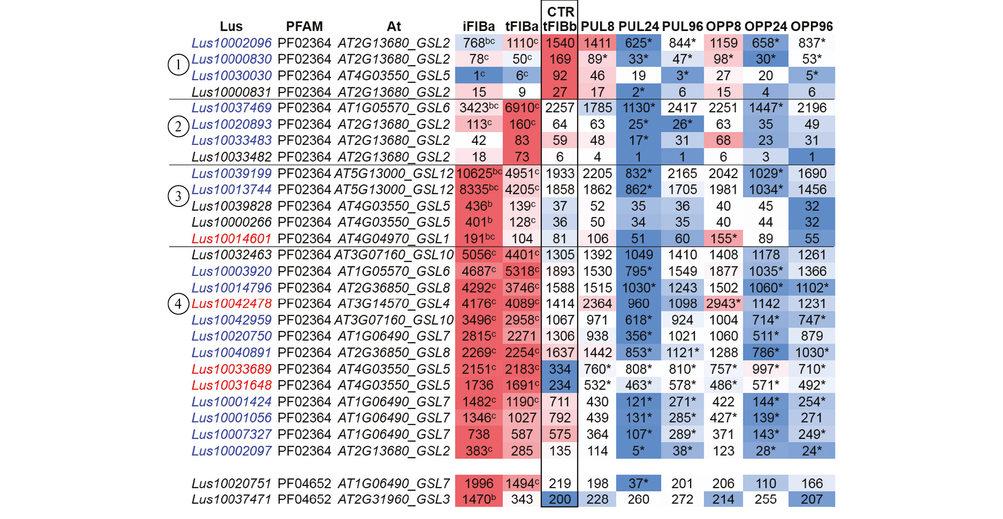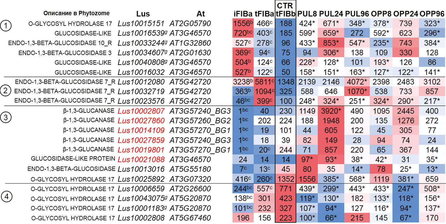 Рис. 2. Перечень генов β-1,3-глюкансинтаз (PF02364, PF04652) и их экспрессия в волокнах льна на разных стадиях развития и при гравистимуляции (в TGR) с разбивкой на кластеры 1–4. Гены, экспрессия которых была достоверна снижена при гравистимуляции в волокнах стебля льна, обозначены синим; гены, экспрессия которых достоверно увеличивалась в волокнах при гравистимуляции по сравнению с экспрессией в волокнах контрольных растений (tFIBb), обозначены красным. * (с) – Различия с контролем (tFIBb) и b – различия c tFIBa достоверны при q < 0.05. Серым фоном выделены гены, экспрессию которых не рассматривали. iFIBa – интрузивно растущие волокна, tFIBa – ранняя стадия формирования ТКС (третичной клеточной стенки). tFIBb – поздняя стадия формирования ТКС, которая служила контролем (СTR) в эксперименте с гравистимуляцией. 8, 24, 96 ч – время фиксации образцов после наклона стебля; PUL – pulling side (тянущая сторона), OPP – противоположная PUL-стороне. Lus – последовательности льна Linum usitatissimum, Аt – последовательности Arabidopsis thaliana.