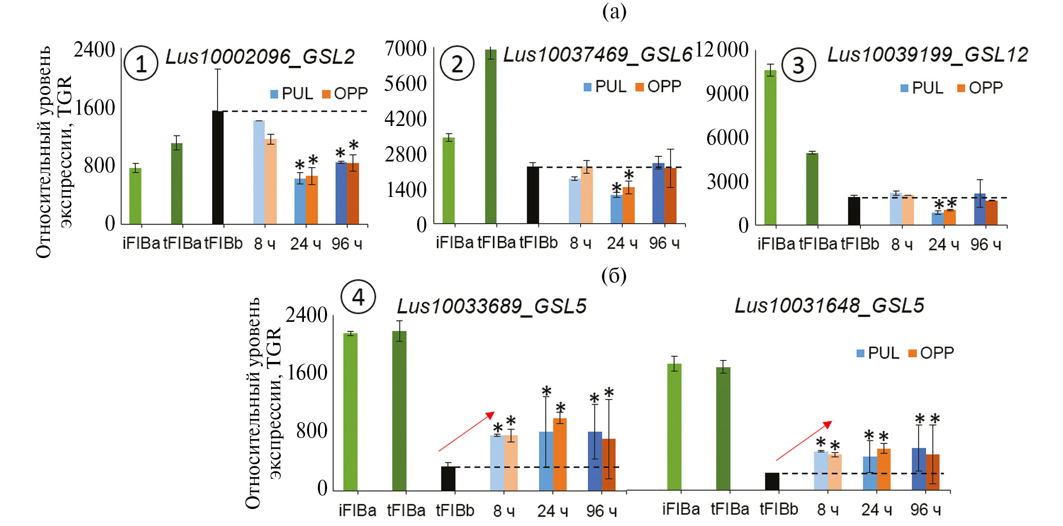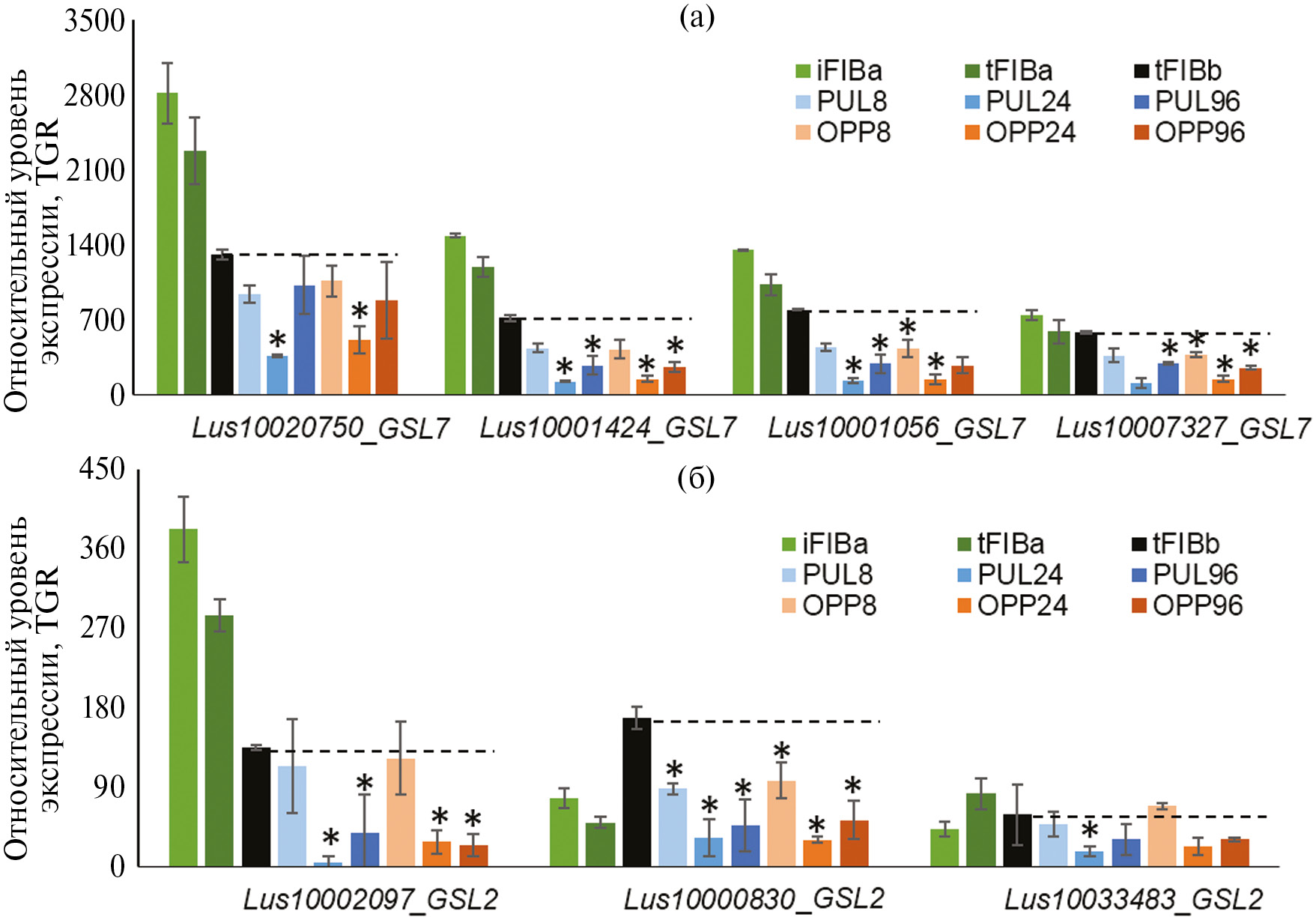 Рис. 4. Гены β-1,3-глюкансинтаз (PF02364), гомологичные ATGSL7 (а) и ATGSL2 (б), имеющие высокий уровень экспрессии в волокнах льна на разных стадиях развития, но понижающие экспрессию при гравистимуляции. * – Различия с контролем достоверны при q < 0.05. iFIBa – интрузивно растущие волокна, tFIBa – ранняя стадия формирования ТКС (третичной клеточной стенки). tFIBb – поздняя стадия формирования ТКС. 8, 24, 96 ч – время фиксации образцов после наклона стебля; PUL – pulling side (тянущая сторона), OPP – противоположная PUL стороне. TGR – total gene reads. Черной пунктирной линией обозначен уровень экспрессии в контрольных растениях без гравистимуляции.