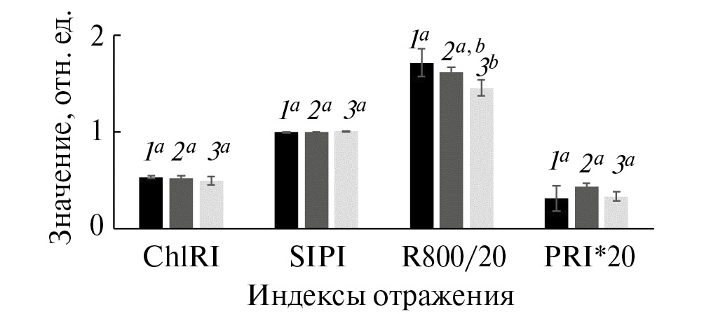 - фотохимический индекс отражения PRI = = (R570 – R531)/(R570 + R531), где R570, R531 – интенсивность отражения света от листовой поверхности на длинах волн 570 и 531 нм соответственно [37];