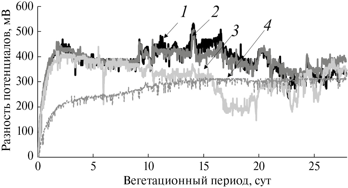 Рис. 4. Формирование разности потенциалов в корнеобитаемой среде редиса в процессе его выращивания с использованием источников света различного спектрального состава: 1 – AFI-5000, 2 – AFI-4000, 3 – AFI-3000, 4 – контроль без растения.