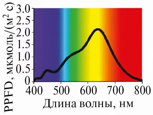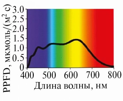 На данный момент накоплено множество экспериментальных данных по влиянию искусственно создаваемых условий световой среды на физиологические параметры растений [13–16]. Тем не менее, вопросы оптимизации продукционного процесса и снижения себестоимости растительной продукции в светокультуре еще не решены окончательно, и ключевое значение для дальнейшего развития производства в условиях защищенного грунта принадлежит разработке и внедрению источников света, эффективных как с точки зрения получения высококачественной растительной продукции, так и экономически выгодных [2]. Нерешенной проблемой остается согласование, с одной стороны, энерго- и ресурсосберегающих технологий освещения, а с другой – нормативных биохимических показателей и вкусовых качеств растительных культур, которые в полной мере зависят от количественных и спектральных характеристик излучения. Исследования последних лет показывают, что растениям для реализации продукционного потенциала необходим полный спектр излучения, приближенный к естественному освещению в видимой области [17, 18], поскольку солнечный спектр содержит в себе все функциональные длины волны как для работы фотосинтетического аппарата с максимумами поглощения света в синей и красной областях спектра, так и для реализации вторичных процессов – от аккумулирования энергии до активации защитных механизмов в растениях [19].