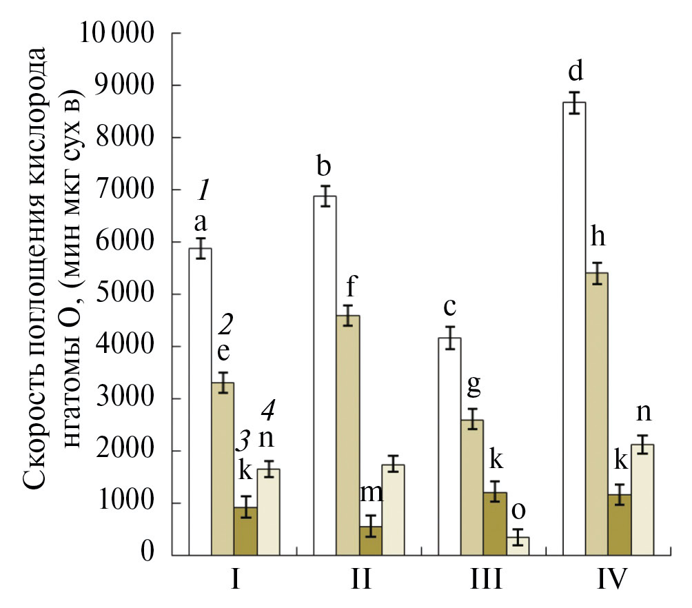 Рис. 4. Влияние обезвоживания и обработки мелатонином на скорость поглощения кислорода зародышами группы 2 18-часовых семян: (1) – скорость поглощения кислорода зародышами (Vобщ); (2) – активность цитохромного пути дыхания; (3) – максимальная активность альтернативного пути дыхания; (4) – остаточное дыхание. Варианты опытов: I – контрольные семена, II–семена после обработки мелатонином, III – семена после обезвоживания, IV – семена после обезвоживания и обработки мелатонином. На рисунках представлены средние арифметические значения и их стандартные ошибки. Статистически значимые различия между средними значениями опытных и контрольных образцов определяли с помощью Tukey тестa в программе ANOVA, результаты, относящиеся к соответствующему субстрату (1 или 2), отмеченные разными буквами, статистически значимы при Р ≤ 0.05.