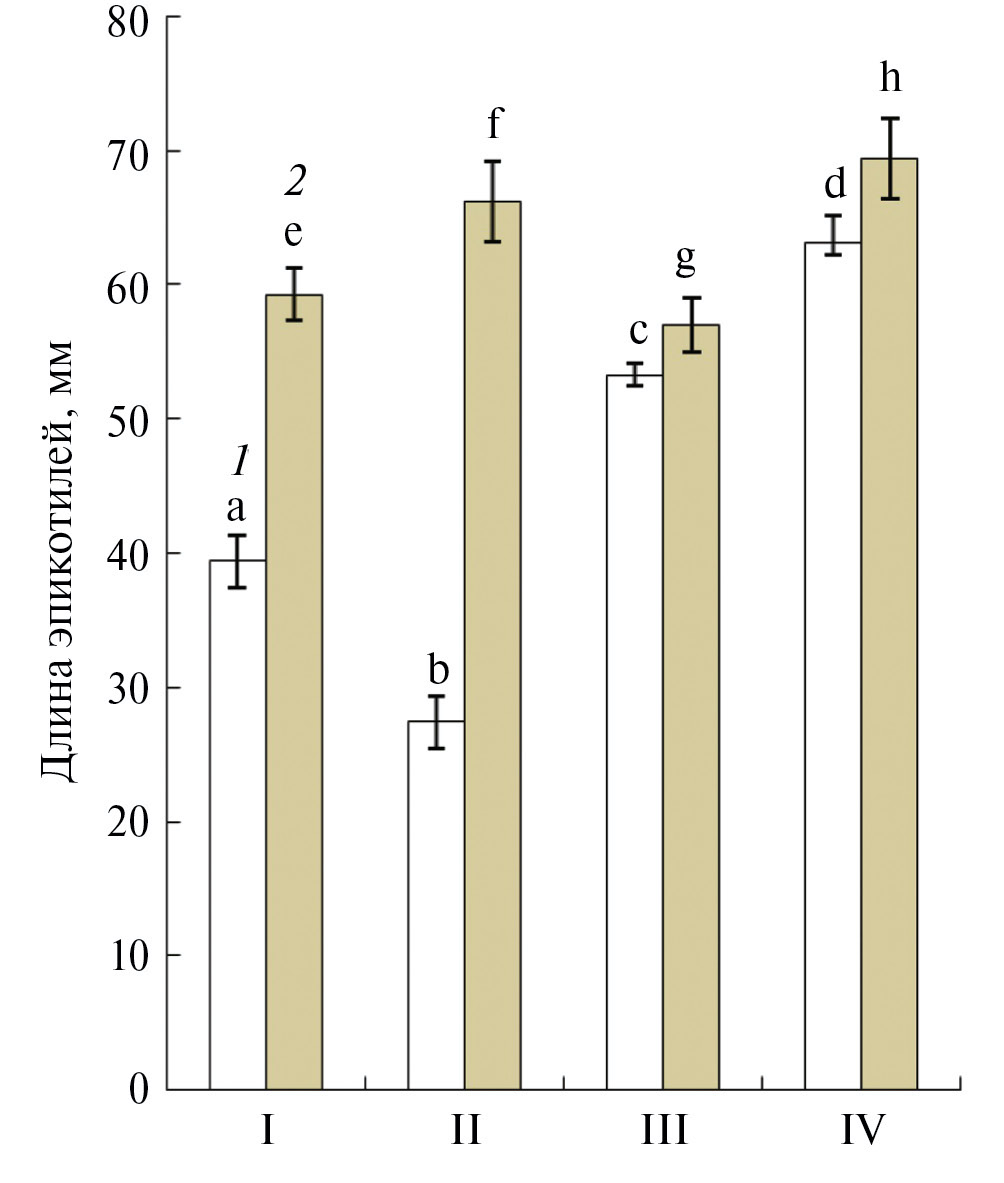 Рис. 5. Влияние обезвоживания и обработки мелатонином на длину эпикотилей 5-дневныхпроростков гороха, выросших из семян зародышей группы (1) и зародышей группы 2 (2). Варианты опытов: I – контрольные семена, II – семена после обработки мелатонином, III – семена после обезвоживания, IV – семена после обезвоживания и обработки мелатонином. На рисунках представлены средние арифметические значения и их стандартные ошибки. Статистически значимые различия между средними значениями определяли с помощью Tukey тестa в программе ANOVA, результаты, отмеченные разными буквами, статистически значимы при Р ≤ 0.05.