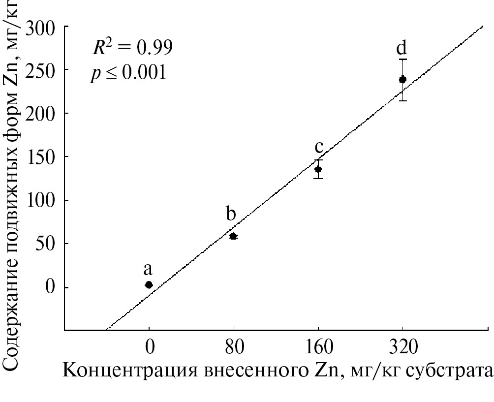 Средняя концентрация подвижных форм Zn, оставшихся в субстрате после внесения сульфата Zn, увеличивалась линейно во всем диапазоне изученных концентраций (рис. 1). Из образцов использованного в эксперименте песка 1 N ацетатно-аммонийным буфером было извлечено приблизительно 70–80% от внесенного Zn, что указывает на его высокую подвижность и доступность для растений. Данные об уровнях содержания Zn в субстрате были использованы для расчета величины коэффициента биологического накопления.