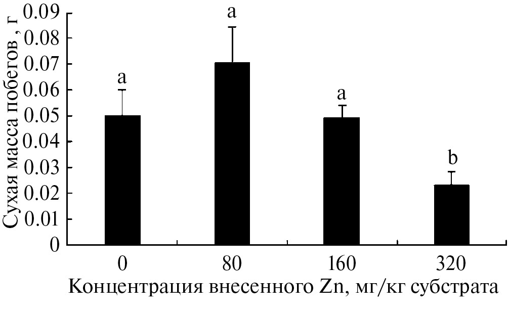 Рис. 3. Влияние 2-месячного воздействия Zn на накопление сухой биомассы надземных органов сеянцев Sisymbrium lypskyi. Приведены данные для нормально развитых растений. Разными буквами обозначены значимые различия между вариантами опыта при P < 0.05.