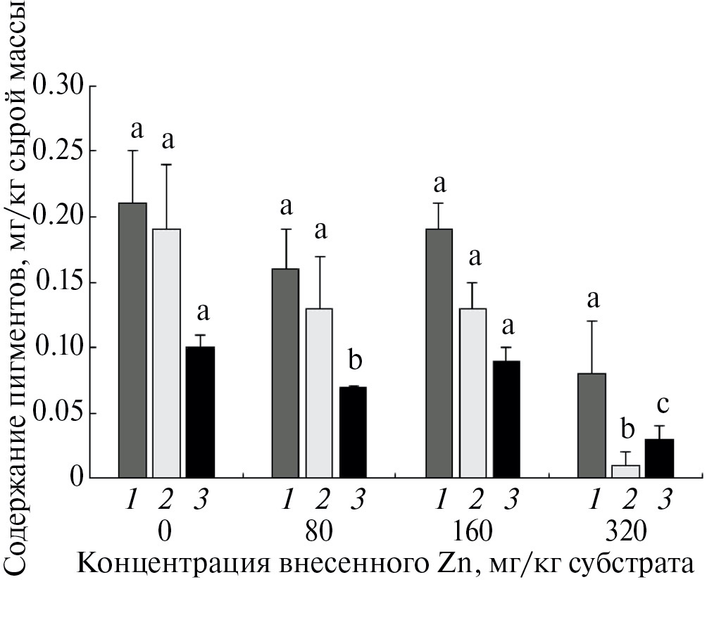 Рис. 5. Влияние 2-месячного воздействия Zn на содержание хлорофилла a (1), хлорофилла b (2) и каротиноидов (3) в листьях сеянцев Sisymbrium lypskyi. Обозначения статистической значимости различий приводятся отдельно для хлорофилла a, хлорофилла b и каротиноидов. Приведены данные для нормально развитых растений. Разными буквами обозначены значимые различия между вариантами опыта при P < 0.05.