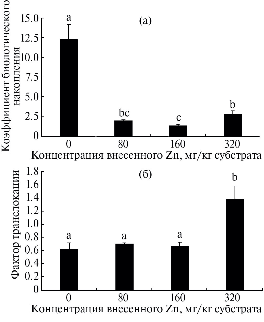 Рис. 6. Отношение содержания Zn в листьях сеянцев Sisymbrium lypskyi к его содержанию в субстрате (коэффициент биологического накопления) (а) и отношение содержания Zn в листьях к его содержанию в корнях (фактор транслокации) (б) после 2-месячного произрастания при разных уровнях Zn в субстрате. Разными буквами обозначены значимые различия между вариантами опыта при P < 0.05.