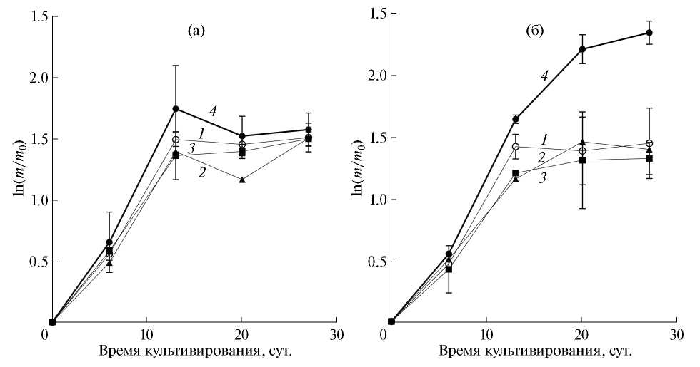 Рис. 2. Кривые роста клеток каллусной культуры L. angustifolia в полулогарифмической системе координат при световом (а) и темновом (б) режимах освещения на питательных средах, содержащих: 1 – α-НУК (2.0 мг/л) + кинетин (0.001 мг/л); 2 – 2,4-Д (2.0 мг/л) + БАП (2.0 мг/л); 3 – α-НУК (1.0 мг/л) + БАП (0.5 мг/л); 4 – α-НУК (2.0 мг/л) + + БАП (0.1 мг/л).