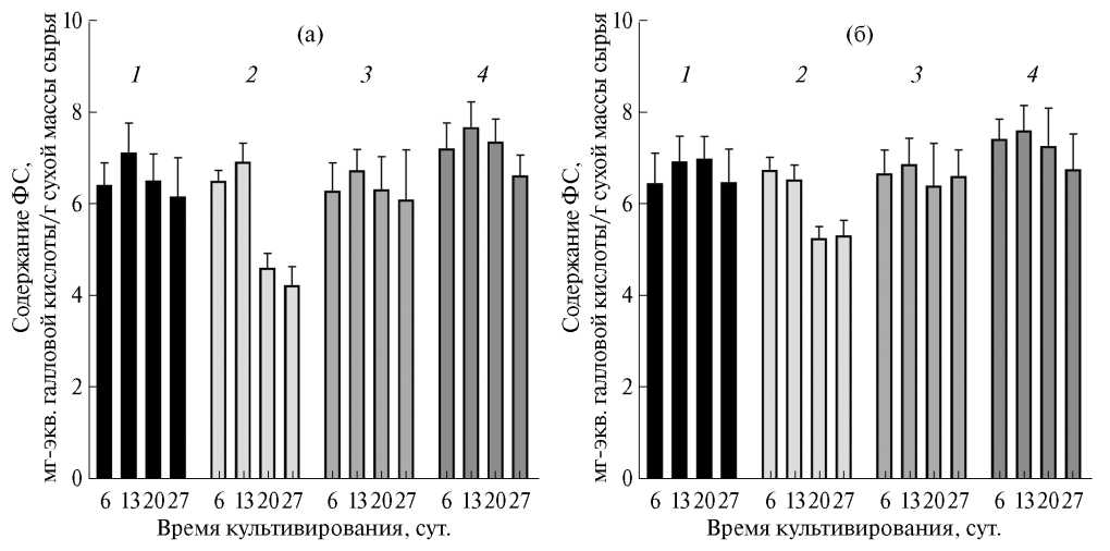 Результаты количественного анализа суммы ФС по методу Фолина – Чокальтеу во всех образцах клеточных культур при световом (рис. 3а) и темновом (рис. 3б) режимах культивирования показали сходные тенденции зависимости содержания ФС от времени – максимальное содержание достигалось к 13 дню культивирования, а затем наблюдалось снижение. По результатам ANOVA и теста Тьюки для множественных сравнений статистически значимый (P < 0.0001) вклад в различия между отдельными опытами дают время (12.13%), тип среды (30.65%) и их сочетание (15.57%) (табл. 3). Световой режим не влияет на накопление ФС со статистической значимостью. По результатам множественных сравнений можно заключить, что культура, выращенная на среде 2Н, содержащей 2.0 мг/л α-НУК и 0.1 мг/л БАП, дает больший выход фенольных соединений в сравнении с остальными. Таким образом, данный состав продемонстрировал наиболее высокие значения ростовых параметров и содержания фенольных соединений.