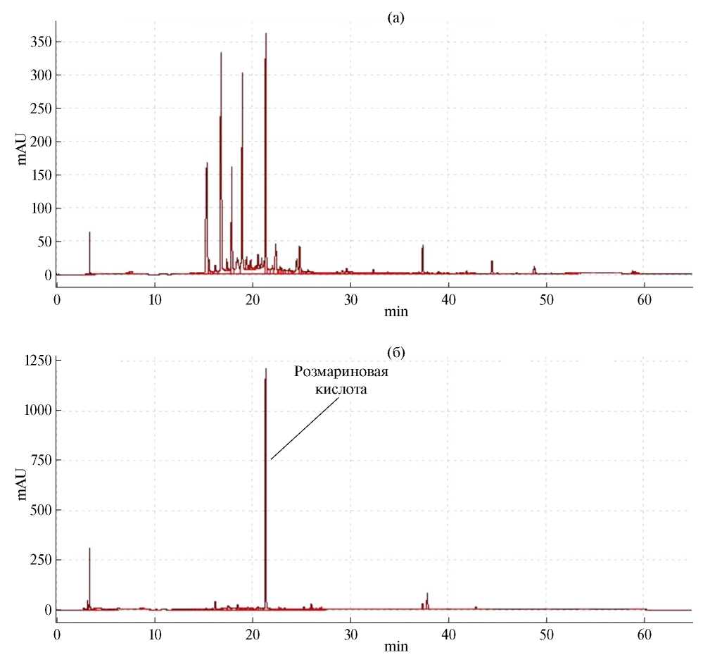 Рис. 4. ВЭЖХ-хроматограммы 96% этанольного экстракта цветков L. angustifolia (а) и каллусной культуры 2Н (б).