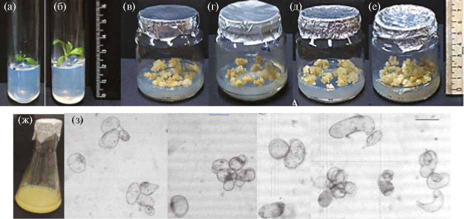 Рис. 1. Стерильные 5- (а) и 14-дневные (б) растения Lychnis chalcedonica; каллусная культура линий 5Г (в), 14ОП (г), 5К (д) и 14К (е) через 25 суток культивирования (6 пассаж); суспензионная культура (ж) и ее клетки (з). Экспланты: Г – гипокотиль, ОП – основание побега, К – корень. Размер бара – 100 мкм.