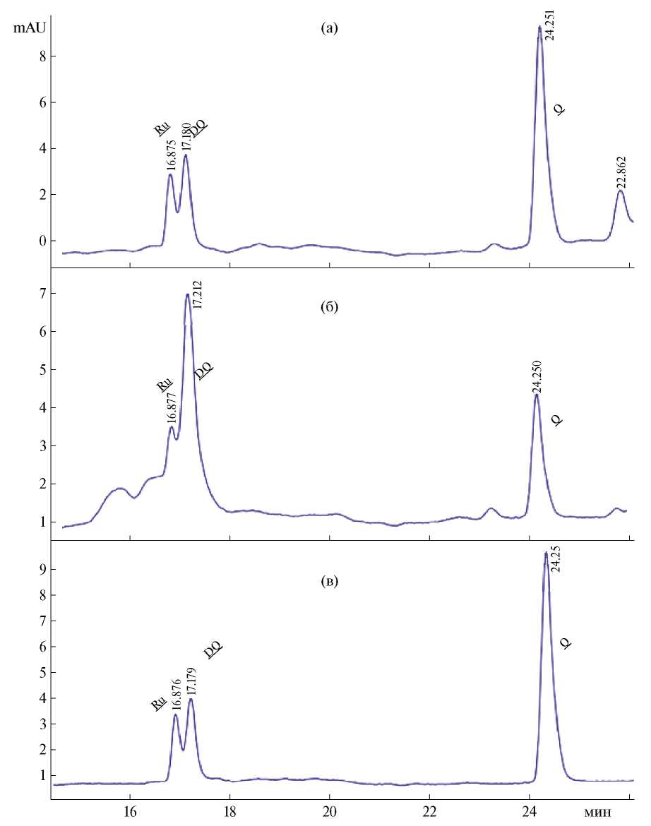 Рис. 2. Хроматографическое разделение флавоноидов стандартных растворов: а – рутин (Ru) С = 0.1 мг/см3, λ = 254 нм (время выхода – 16.691 ± 0.080 мин); б – дигидрокверцетин (DQ) С = 0.1 мг/см3, λ = 290 нм (время выхода – 17.252 ± 0.090 мин); в – кверцетин (Q) С = 0.1 мг/см3, λ = 360 нм (время выхода – 24.220 ± 0.050 мин).