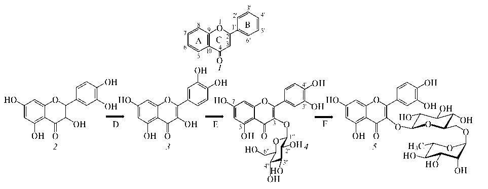 Рис. 4. Структурные формулы исследуемых флавоноидов и ферменты их биосинтеза. 1 – общая формула; 2 – дигидрокверцетин; 3 – кверцетин; 4 – изокверцитрин; 5 – рутин; D – FLS (флаванолсинтаза); E – F3GT (флавонол-3-О-глюкозилтрансфераза); F – F3G6″RhaT (флавонол-3-О-глюкозид 6"-O-рамнозилтрансфераза).
